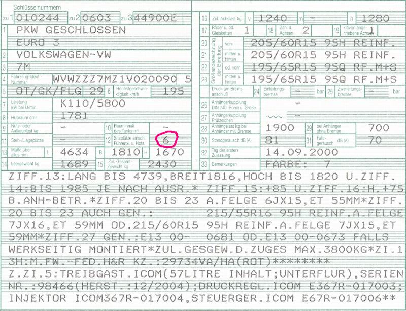 Nein, im Ernst, mein Sharan hatte mit 85 l Diesel im Tank und 7 Sitzen, sonst keinen „Auffälligkeiten“, ohne Fahrer auch schon 1840 Kilo. Ich habe aber auch keine Sitzbeschränkung im Fahrzeugschein. Also am tatsächlichen Leergewicht kann das nicht liegen, denn bei meinem steht im Fz-Schein auch 16hundertirgendwas bei Ziffer 14. Allerdings unten im Text dann „Ziff.14: bis 2003 je nach Ausrüstung“.