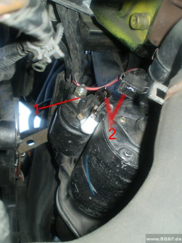 Bei der Nummer 1 sitzen die beiden Kabel vom oberen Bild. Ich habe die Mutter wieder draufgedreht, damit sie nicht wegkommt. Weil diese ja blank ist und guten Kontakt liefert. Mit der Nummer 2 ist der Stecker am Magnetschalter gemeint. Dieser muss auch gelöst werden.