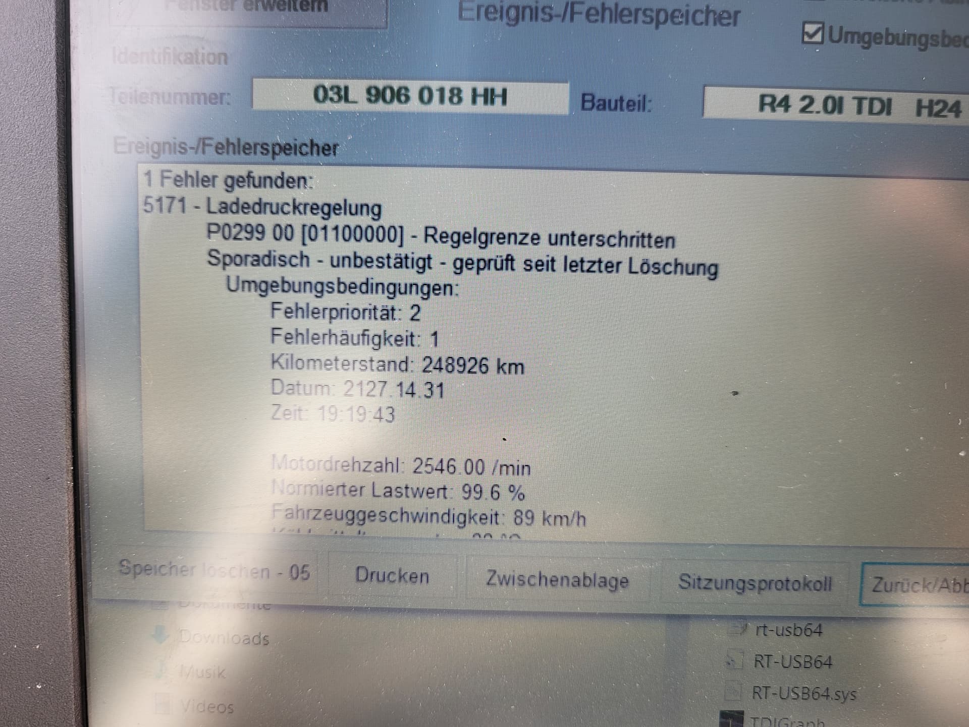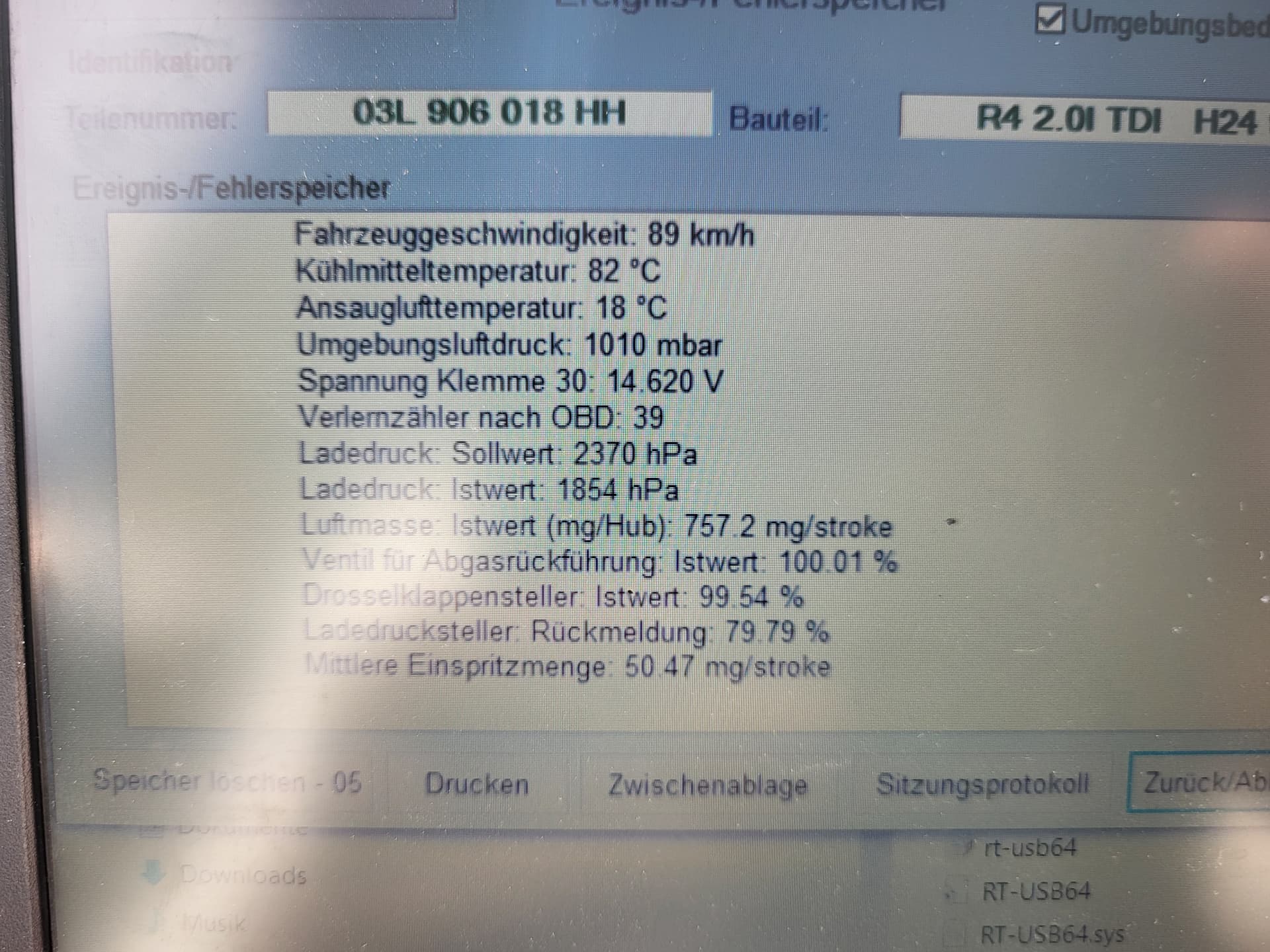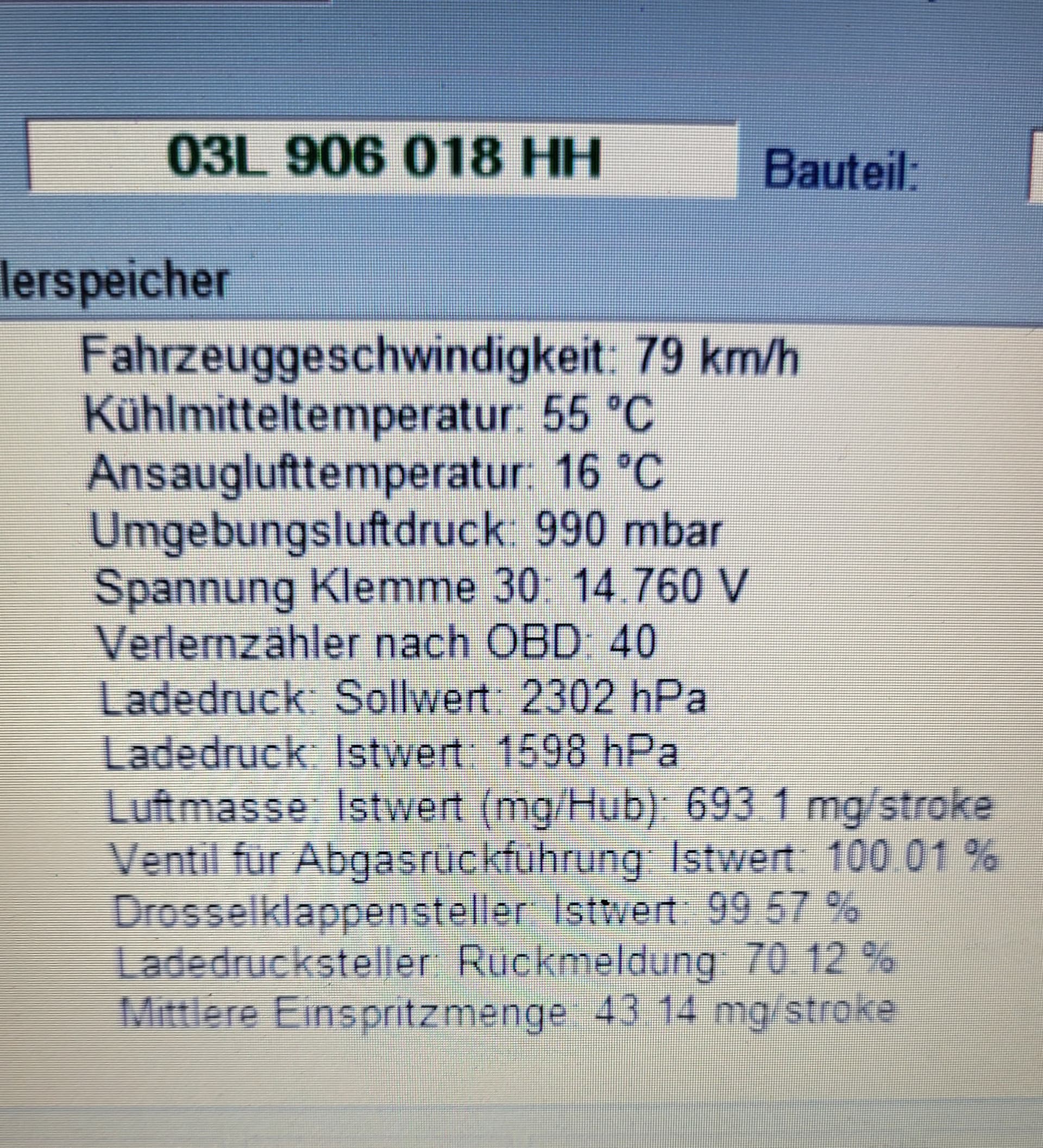 Jetzt zu meinen Problemen. Vor einigen Wochen fing der Lüfter an nach jeder Fahrt in etwa 5 Minuten nachzulaufen und start/stop funktion ging nicht mehr. (Kein Fehlercode) Ok kann ja mal sein , dpf oder was auch immer. Es hörte aber nicht auf. Kurze zeit Später kam P029900 Ladedruck fehler hinzu. Habe dann das AGR Ventil, dabei zusätzlich Saugrohr und alles was dazu gehört ausgebaut und gesäubert, bis auf den AGR Kühler sah der Abgas/Luftstrang sehr gut aus, klar bisschen Rußig aber für 250tkm noch gut. Alle Dichtungen kamen neu auch zwischen Turbo und DPF. Die 3 Temperatur Sensoren beim DPF und Turbo, gereinigt und mit VCDS überprüft. Alles zusammen gebaut und mit VCDS adaptiert. ABER weiterhin selbe Problematik ab gewisser Drehzahl und Gang schmeisst er P029900 , Lüfter läuft nach , kein start stop möglich. Laut VCDS passen Ladedruck Soll und Istwert nicht. Augenscheinlich läuft der Turbolader rund , keine unwucht. Habe jetzt noch das VTG und das kleine Magnetventil über dem Ölfilter getauscht. Keine Änderung. Habe jetzt noch das N75 Ventil bestellt. Auf den ersten Blick besteht keine undichtigkeit an den Schläuchen, dem werde ich aber noch nach gehen falls das N75 auch keine Änderung bringt. Habe allmöglichen Werte mit VCDS geprüft und anscheinend ist alles I.O.. Kann mir aktuell noch nicht Vorstellen das der DPF dicht ist oder der Turbo den Geist aufgegeben hat, ich möchte erst alles andere ausschließen. An sich läuft der Motor rund.