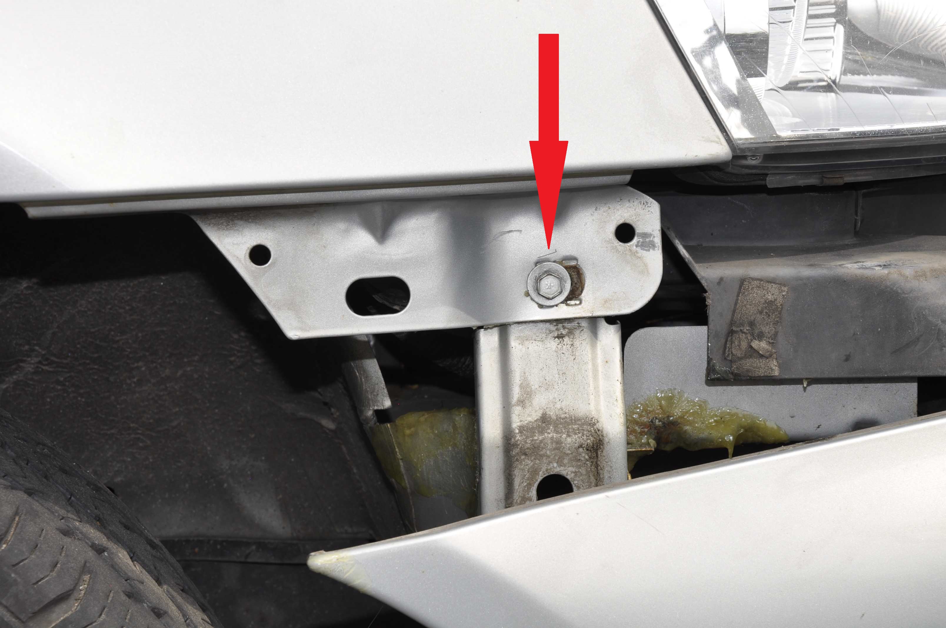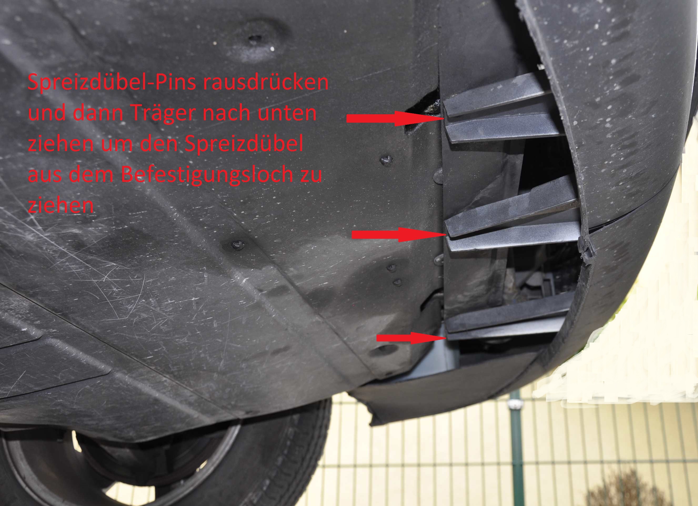 Zum Entfernen des Stoßstangenträgers zunächst 2 Pins aus der Mitte der Spreizniete rausdrücken und eine Torxschraube lösen. Jetzt kann der Stoßstangenträger entfernt werden