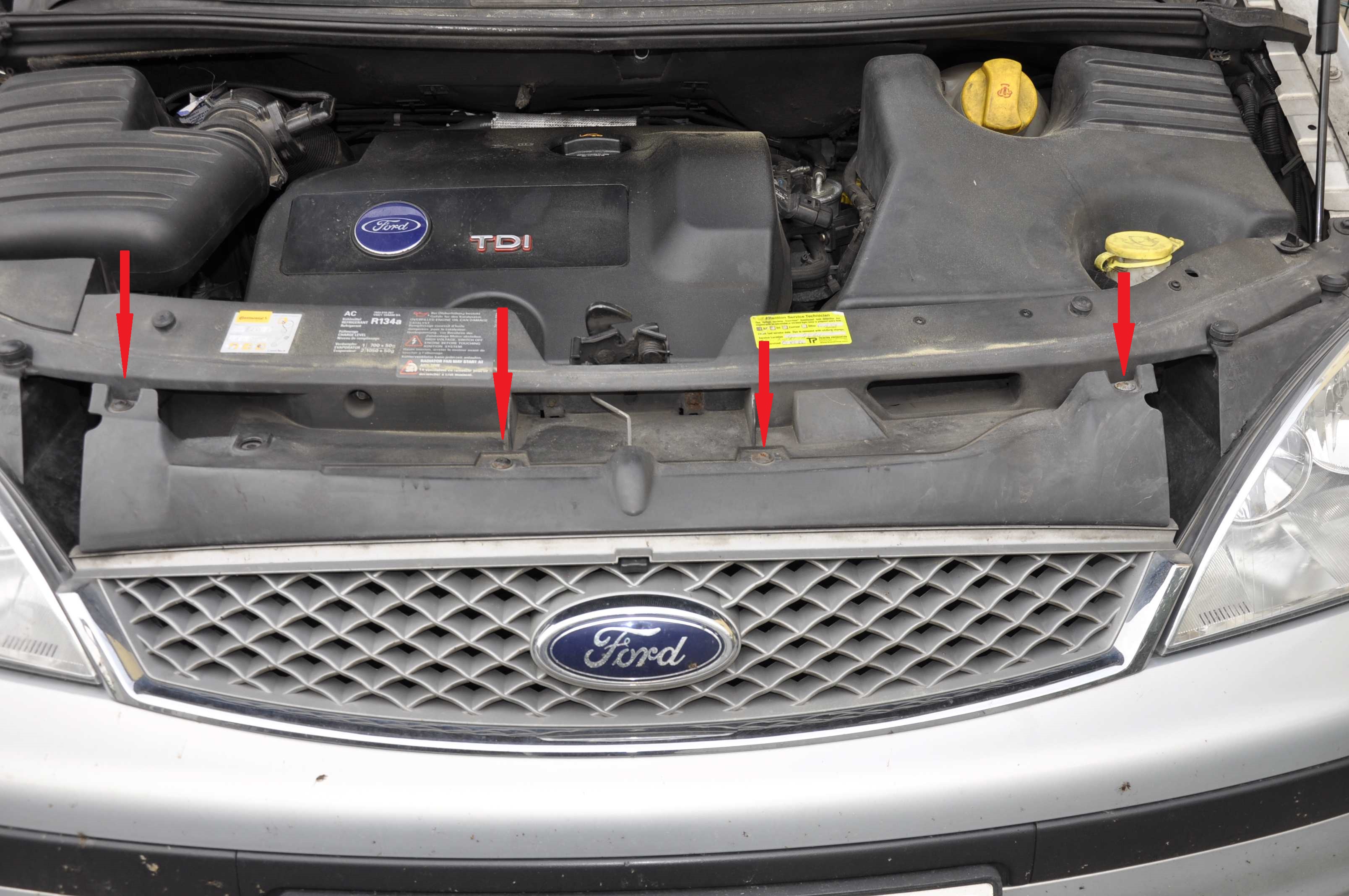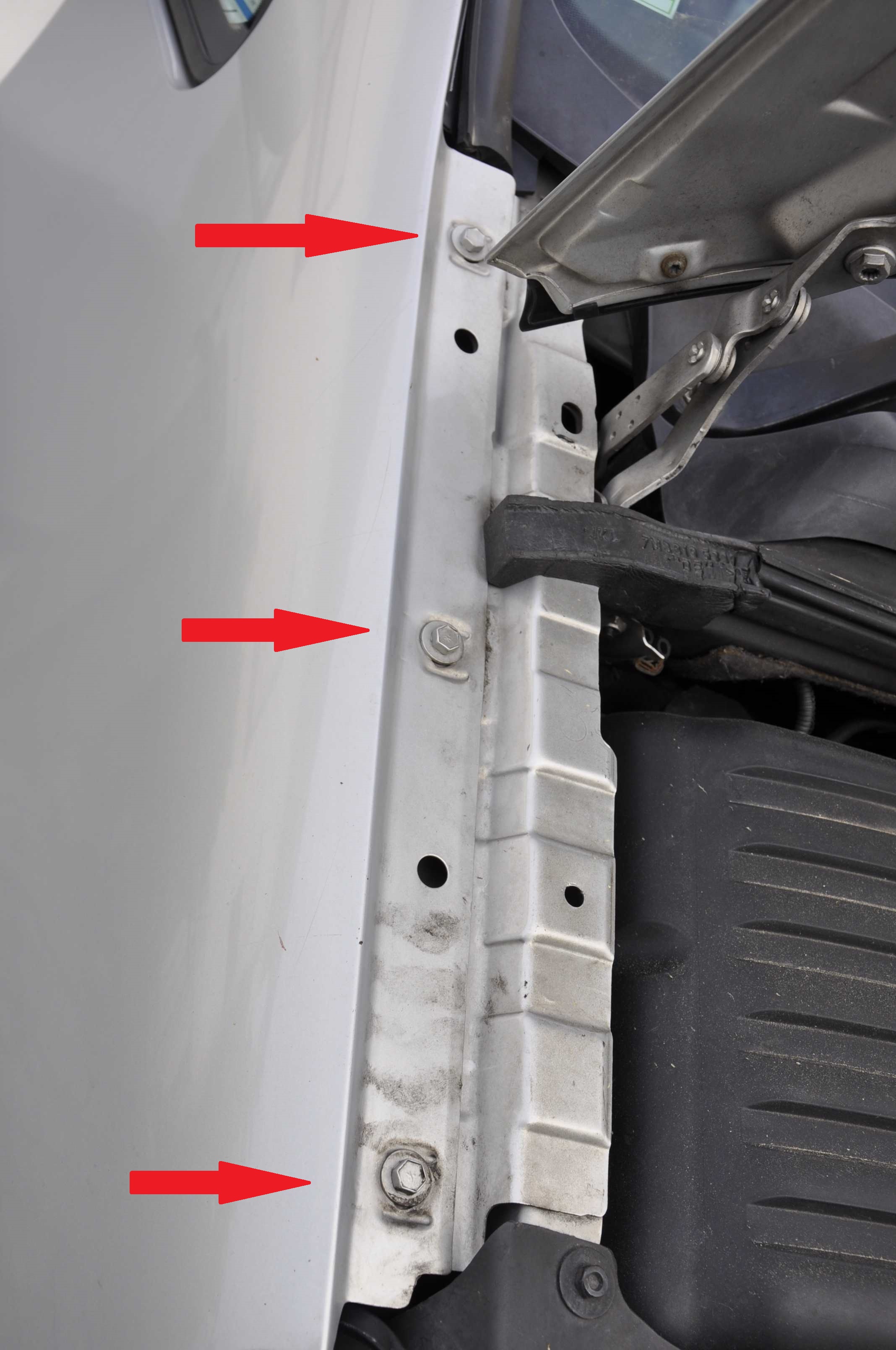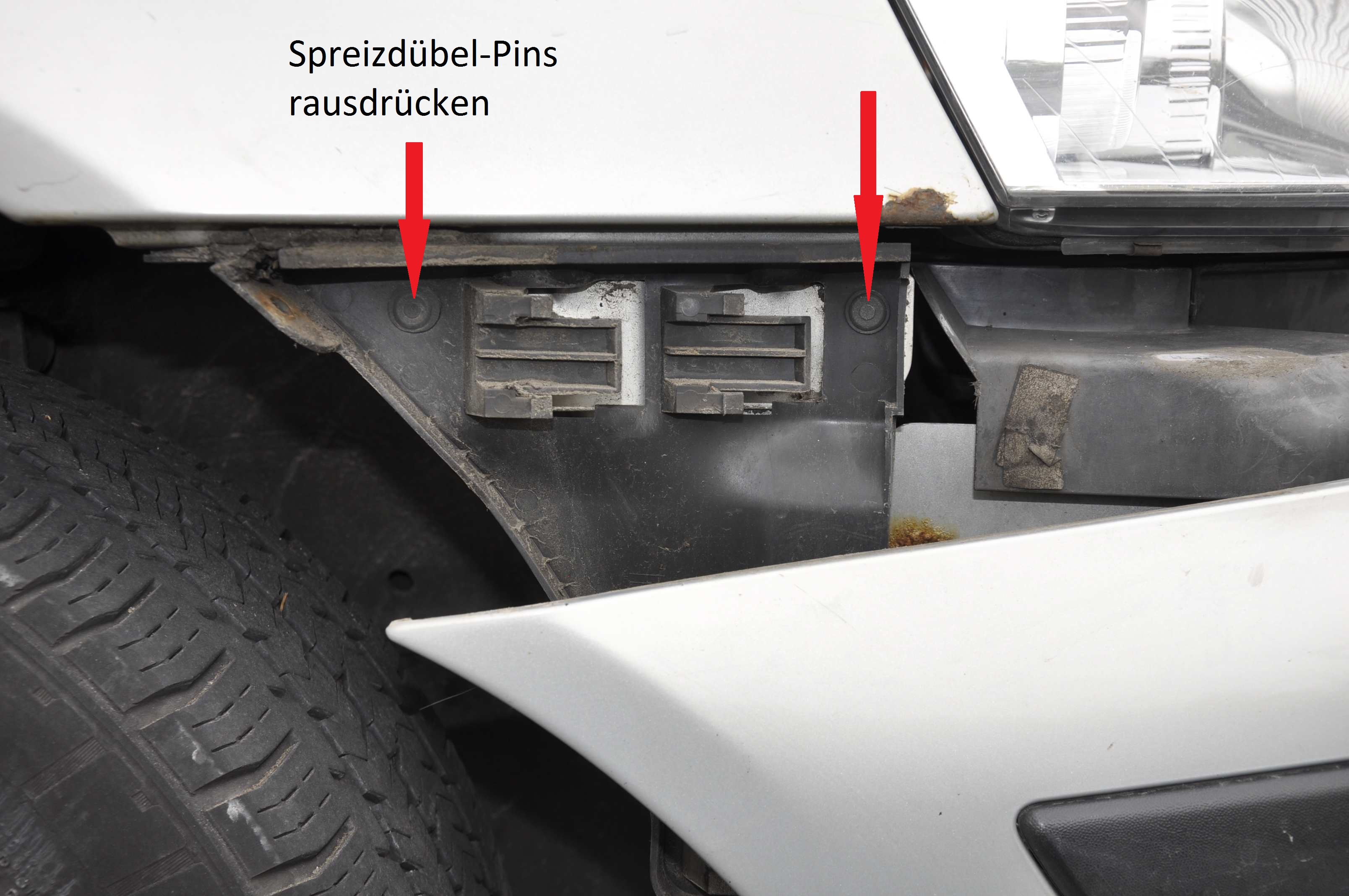 Danach die vordere Stoßstange (zumindest) einseitig lösen. Dazu sind 4 Schrauben am Grill zu entfernen und 3 Spreizniete am Unterwagen.