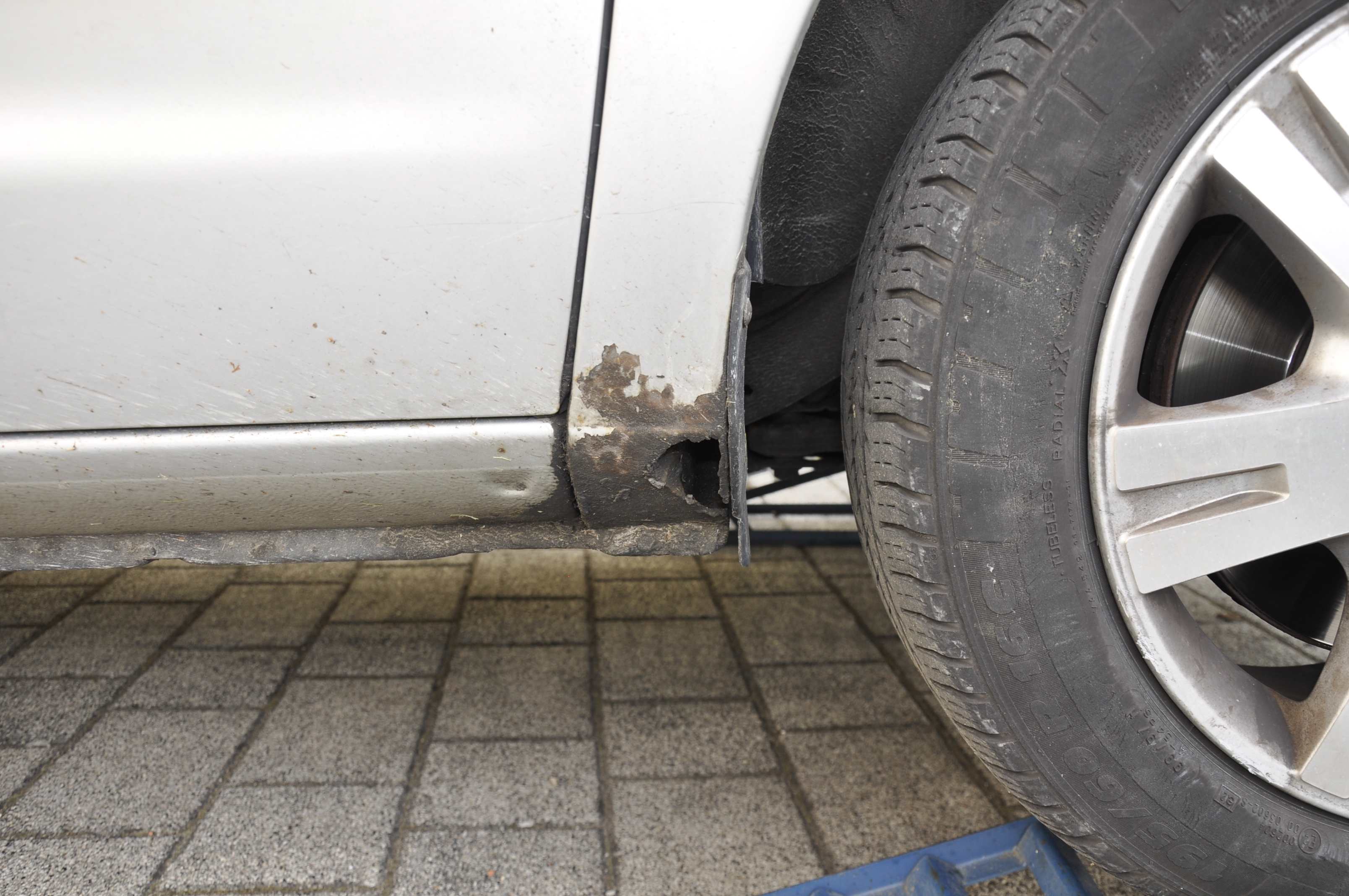 Der SGA2 wurde seit Juni 2000 gebaut. Nur wer die Drecksammler hinter den Radinnenverkleidungen regelmäßig gereinigt hat und so dafür gesorgt hat, dass das Spritzwasser abfließen kann, wird dort keinen Rost am Kotflügel finden. Auf den Schweller habe ich immer gut aufgepasst, auf den eingebauten Drecksammler zwischen Kotflügel und Karosserie leider nicht. Irgendwann hat sich dort ein Loch gezeigt, welches weder mir, noch dem TÜV gefällt. Prinzipiell kann man natürlich einen neuen Kotflügel kaufen und diesen in der passenden Farbe lackieren lassen. Bei Ibäh kann man neue Kotflügel in der passenden Farbe lackiert kaufen. Ich habe lange nach einem originalen Kotflügel gesucht, der original in meiner Farbe lackiert ist. Irgendwann habe ich einen gefunden, der zwar innen bereits verrostet, aber noch nicht durchgerostet war. Dazu war er billig und er wurde nicht allzu weit von uns entfernt angeboten.