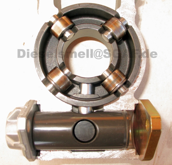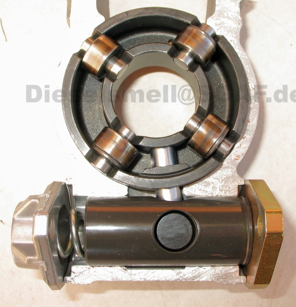Der Ring mit den Rollen ist über einen Verbindungsbolzen mit einem Spritzversteller-Kolben verbunden, der ganz unten quer zur Pumpenlängsachse angerbracht ist. Der Kolben wird von einer Feder gegen einen Metalldeckel gedrückt.