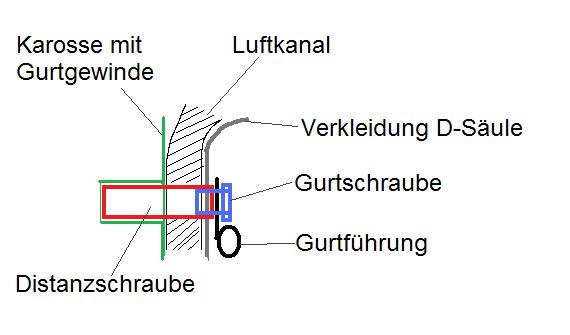 Der Gurt wird bei verwendung eines Luftkanals verlängert da gibts beim Freundlichen eine " Distanzschraube für Fahrzeuge mit elektronisch geregelter Klimaanlage für fahrzeuge mit zweitem Verdamfer" (quelle ETKA). Die wird in das alte Gewinde vom gurt geschraubt dann die Verkleidung ran und den Gurt mit der alten Schraube vom Gurt wieder Befestigt.