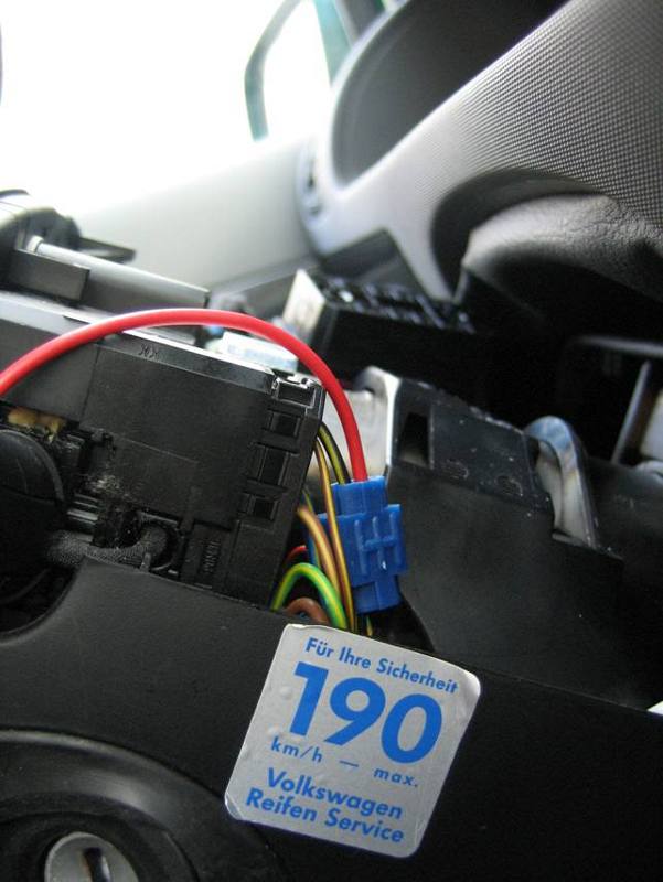Das Plus für die Schaltung habe ich mit einem Schneidverbinder vom Scheibenwischerschalter abgegriffen. (Adernfarbe schwarz/gelb, Plan 1/22 Pfad 289 Schalter E22)