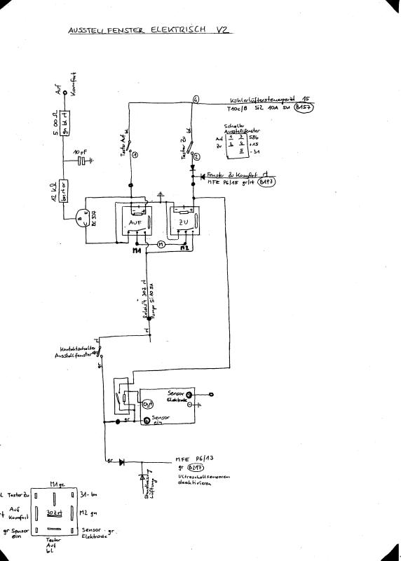 Das Auf-Relais wird über den Taster in der Mittelkonsole und über die Komfortöffnungs-Leitung mit nachgeschalteter Ausschaltverzögerung angesteuert.