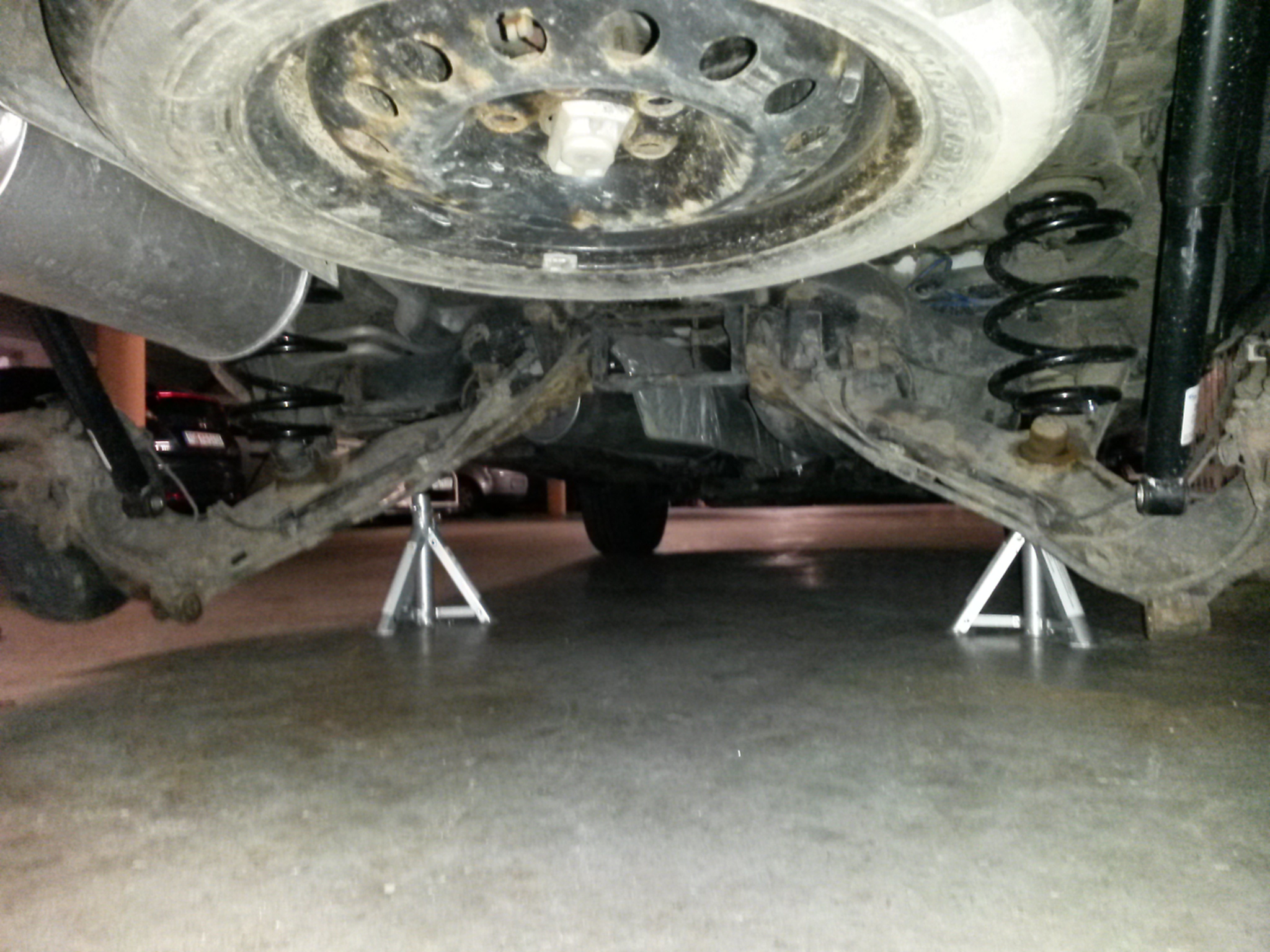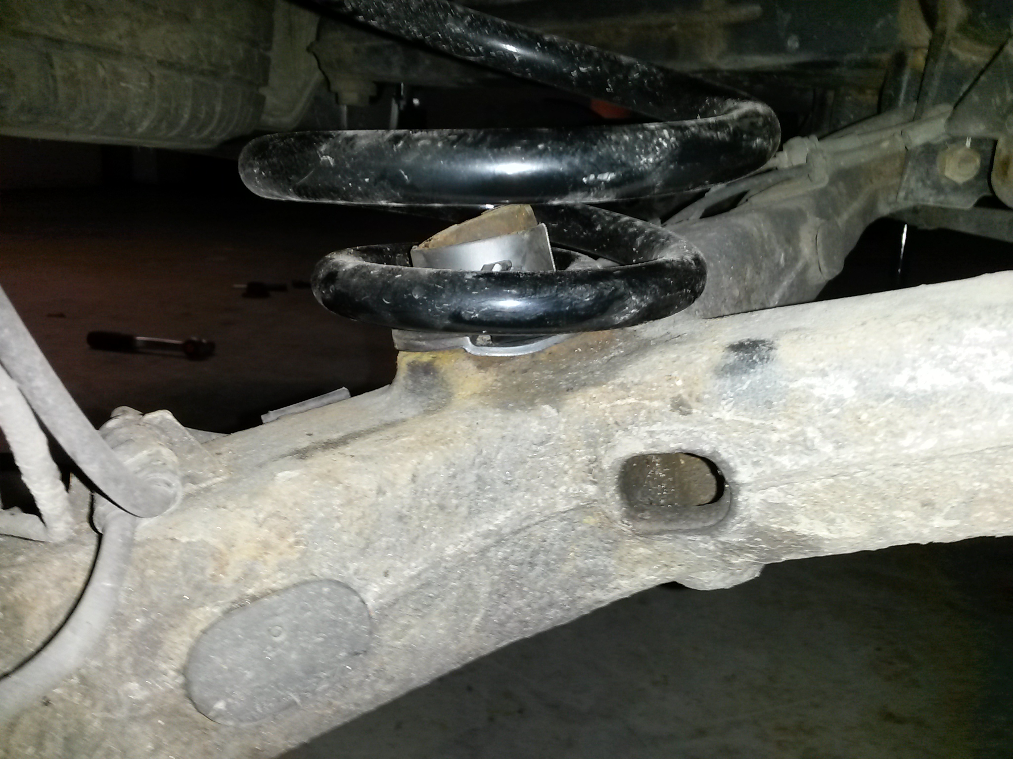 Also wieder Auto hoch und aufgebockt, Räder ab, Stoßdämpfer unten ab. Achse abgelassen, sah dann so aus: