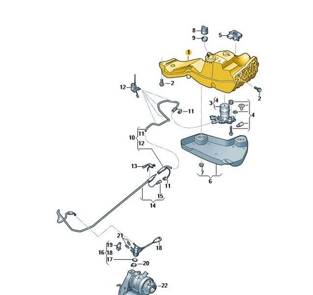 Bei diesem Baujahr sind scheinbar Tank, Heizelement und Sensor verschweißt, lediglich die Pumpe lässt sich mittels dreier Schrauben demontieren. Auf dem Tank steht eine Teilenummer 7N0131877J. Eigentlich wäre es auch kein Problem den ganzen Tank auszutauschen (demontieren war ja kein Problem), aber es gibt ihn einfach nicht als Neuteil (außer bei einem Onlinehändler für einen Mondpreis von 1200€)….
