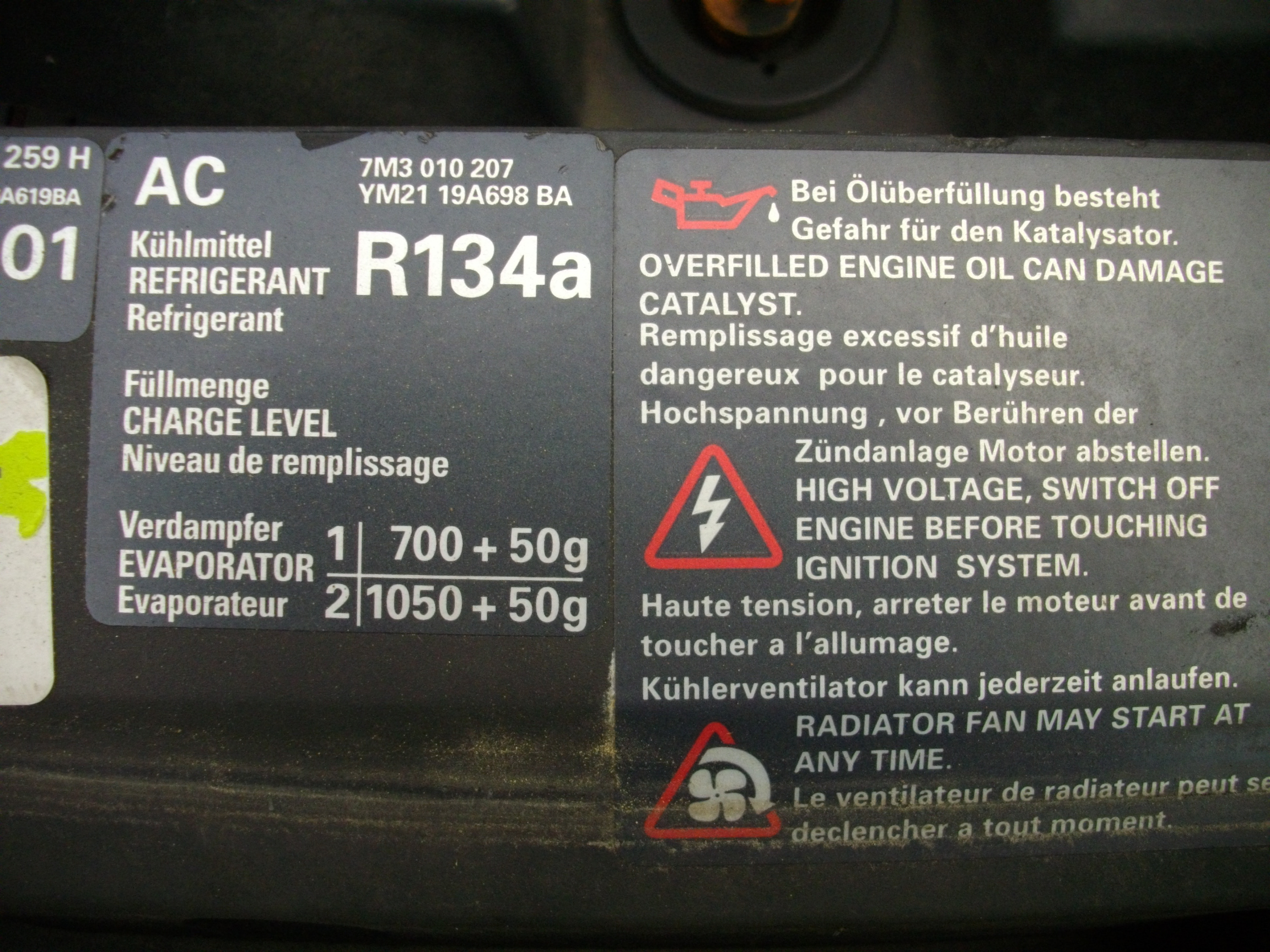 Die Menge auf dem alten Aufkleber mit dem zweiten Verdampfer von 1050 Gramm ist nicht mehr aktuell. Die (ursprünglich) höhere Menge kann laut VW zu unruhigem Motorlauf und zum Ausfall der Klima führen.