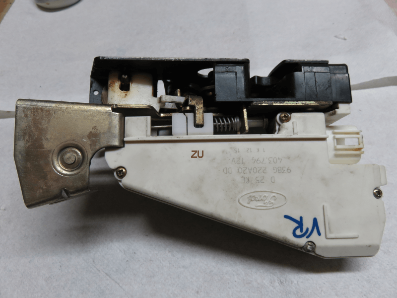 Die eigentlich Funktionsweise des Schlosses ist recht simpel. Im Folgenden sind die wichtigen Teile beschrieben. Die Richtungsangaben (links, rechts, oben, unten) sind dabei auf das jeweilige Bild bezogen und nicht auf die tatsächliche Einbaulage im Fahrzeug. Die tatsächliche Einbaulage lässt sich immer gut an dem großen Hebel für der äußeren Türgriff erkennen.