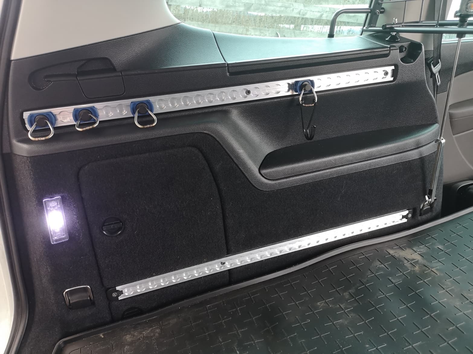 Ich hatte den Fehler gemacht, alles mit U-Scheiben und Stoppmuttern zu machen, mit dem Ergebniss, das die serienmäßigen Verzurrstangen nicht zwischen den Seitenverkleidungen passten, die Stoppmuttern mit U-Scheiben haben zu dick aufgetragen.