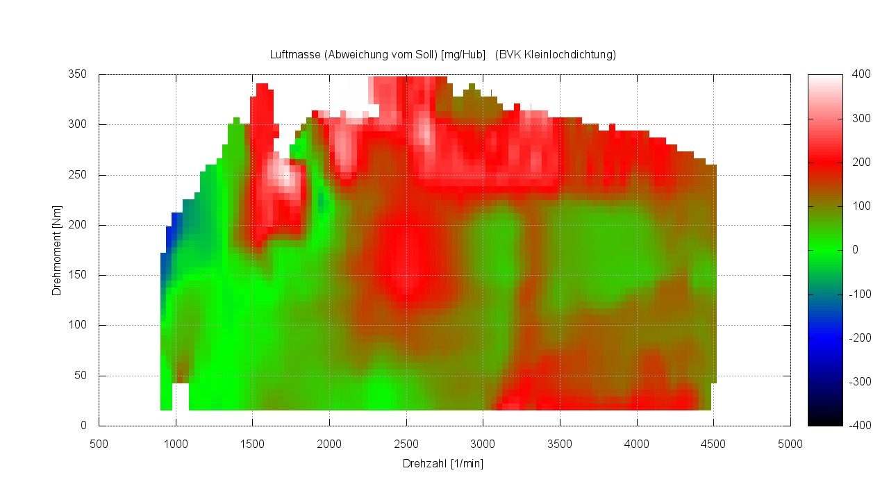 -> Alles was hier grün ist, wird voll ausgeregelt. Nur dort, wo eben noch grüne Bereiche (perfekt ausgeregelt) auf einmal ins rote (zuviel Frischluft) gehen, dort wirkt die Kleinlochdichtung. Dabei interessiert uns grundsätzlich nur der Bereich, in dem die AGR-Regelung überhaupt arbeitet.