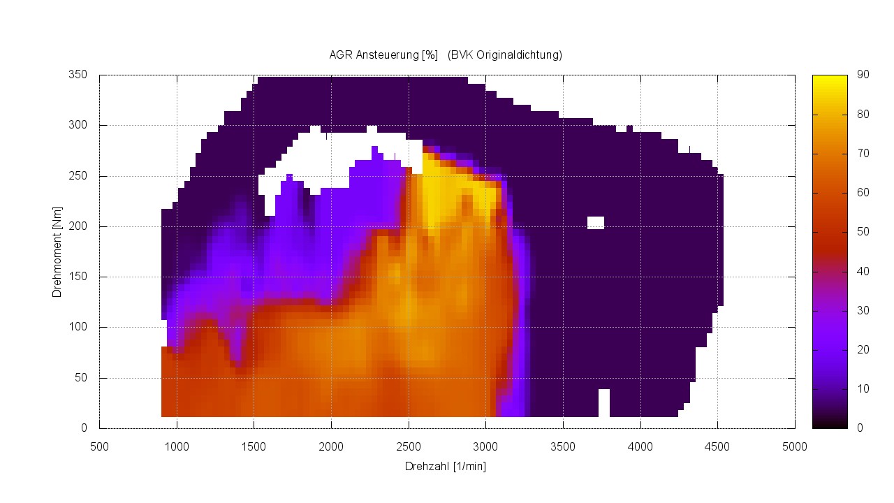 Wenn man sich nun die Plots anschaut, dann ist das AGR-Ventil beim BVK generell viel weiter auf als beim AUY. Mit der Kleinlochdichtung wird also der BVK auch früher und stärker in die Übersteuerung getrieben. … und damit die MAF Abweichung vom Soll auch größer.