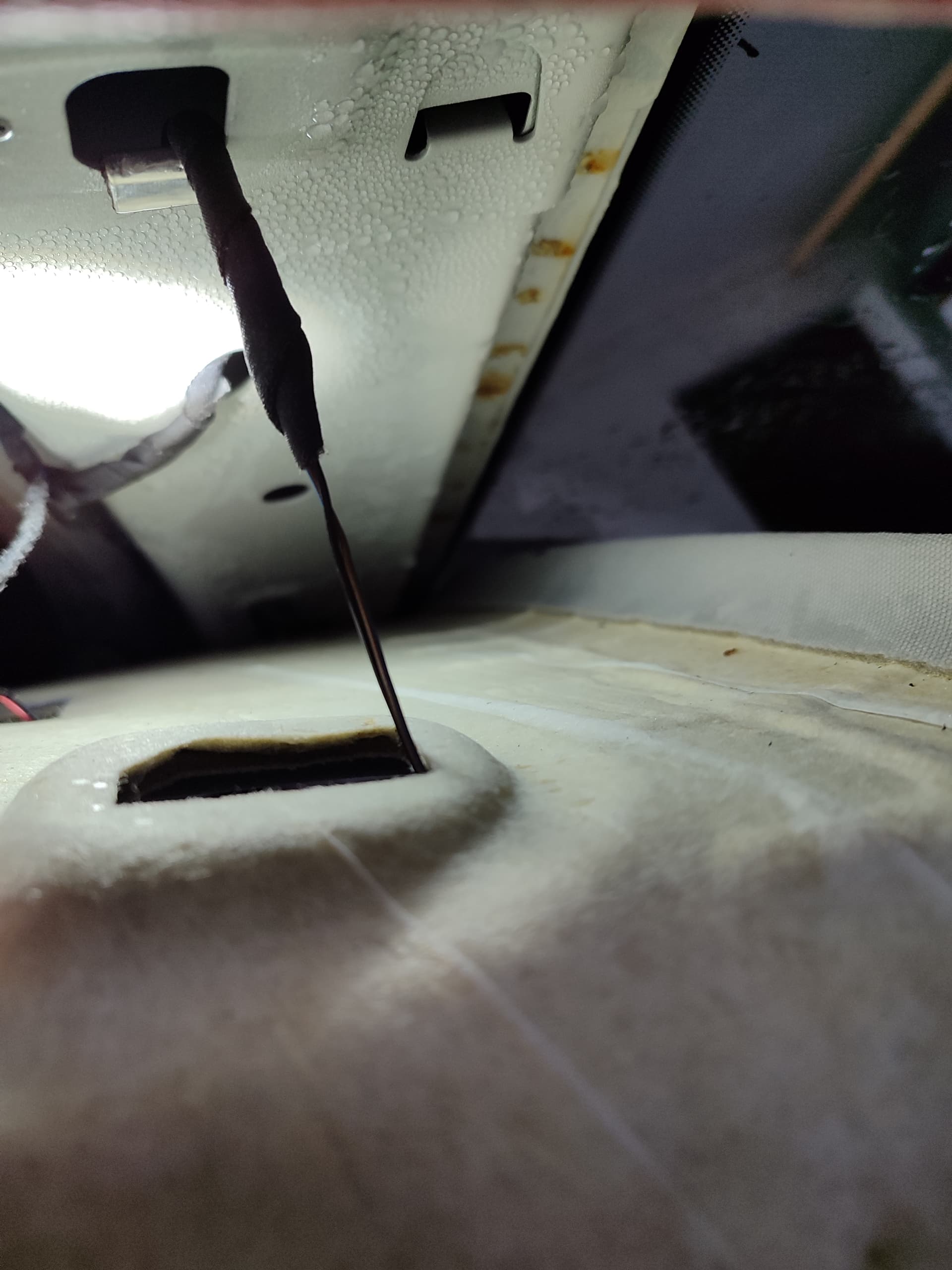 Jetzt hatte ich lange keine Probleme, bis ich heute morgen in mein Auto stieg und der Beifahrersitz, die A-Säule und der Himmel auf der Beifahrerseite nass waren. In der Kosmetikleuchte des Sonnenblende stand richtig Wasser. Es hatte die Nacht über und den vorherigen Tag geregnet.