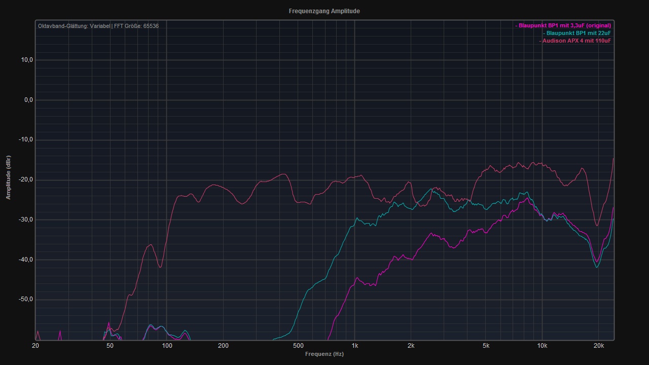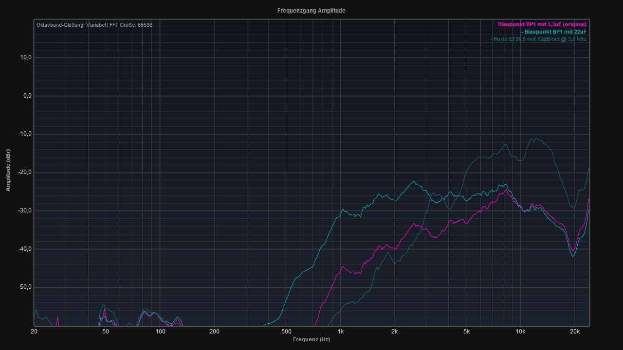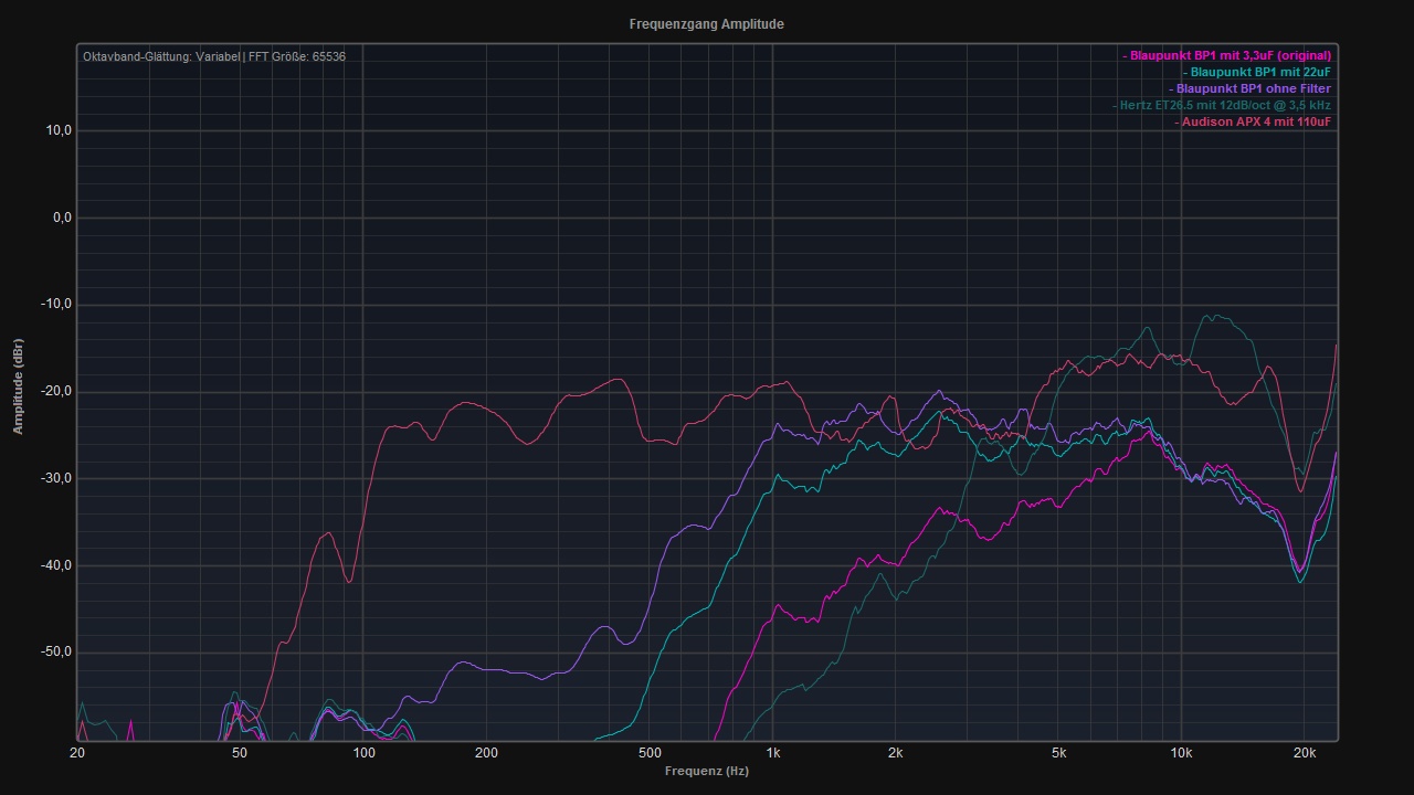 Dieser Vergleich gibt aber einen guten ersten Eindruck, welche Veränderungen durch ein Wechsel der Hochtöner in etwa zu erwarten sind.