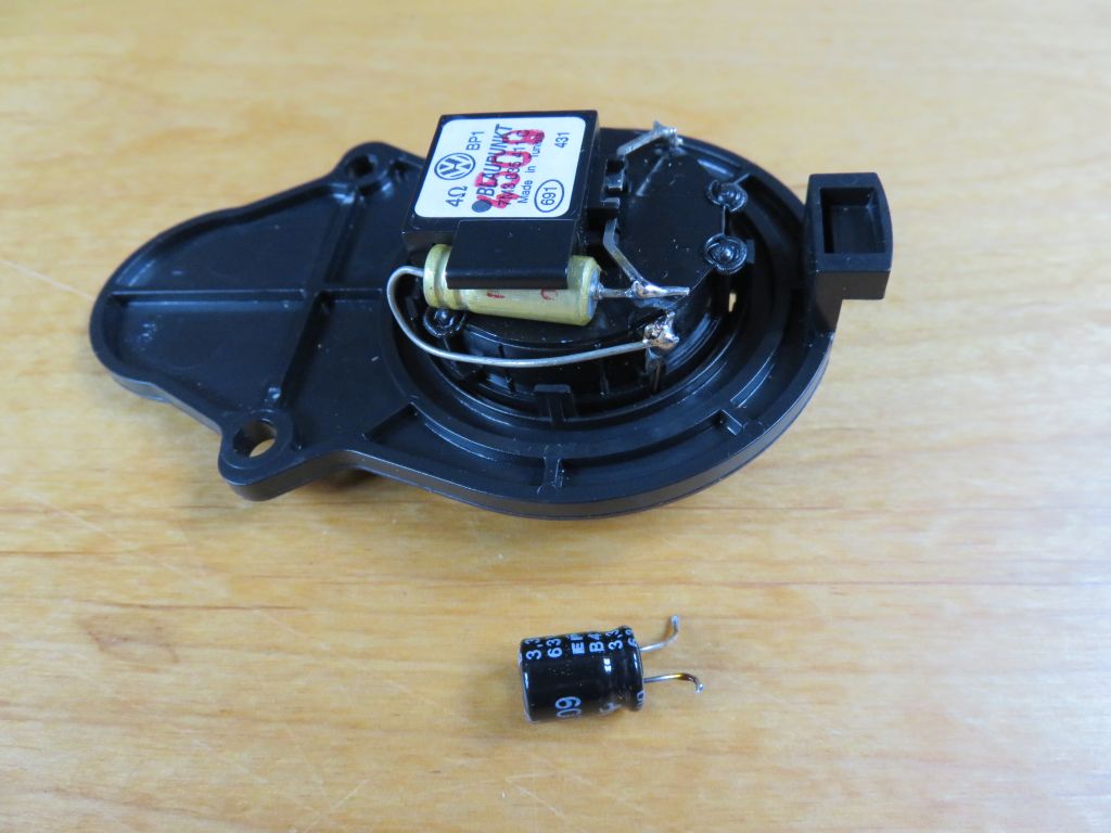 Bei mir funktioniert das auch bei hohen Lautstärken mit dem RCD200 einwandfrei. Nun muss ich den Höhenregler nicht mehr auf +9 drehen und man kann jetzt auch hören, daß da im Amaturenbrett tatsächlich Hochtöner verbaut sind. Sollten sich bei Euch widererwartend evtl. doch in den Spitzen leichte Scheppergeräusche einstellen (Schwingspule schlägt an), dann nimmt man den Kondensator einfach eine Nummer kleiner, z.B. 15uF.