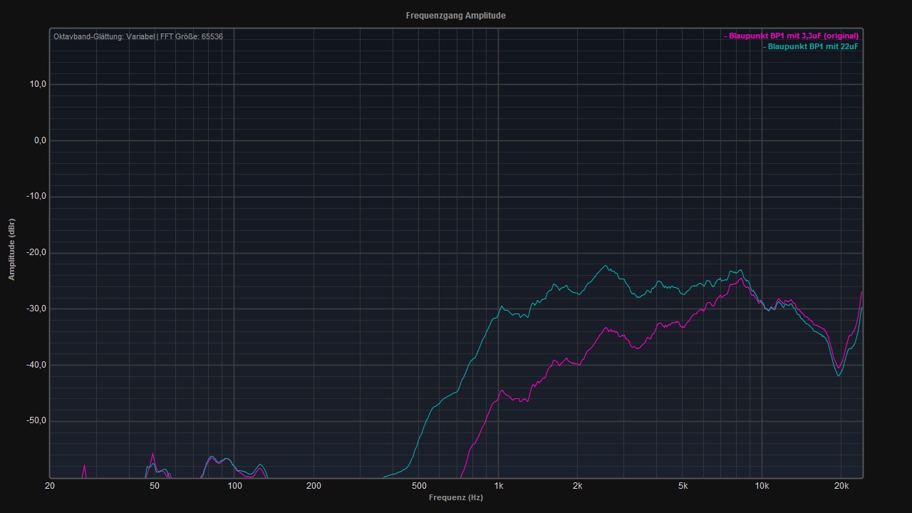 Der Trick besteht einfach darin, den davorgeschalteten Kondensator auszutauschen. Dieser fungiert als einfachste Form einer Frequenzweiche. Im Originalzustand liegt die Grenzfrequenz bei rund 7 kHz (3,3uF).