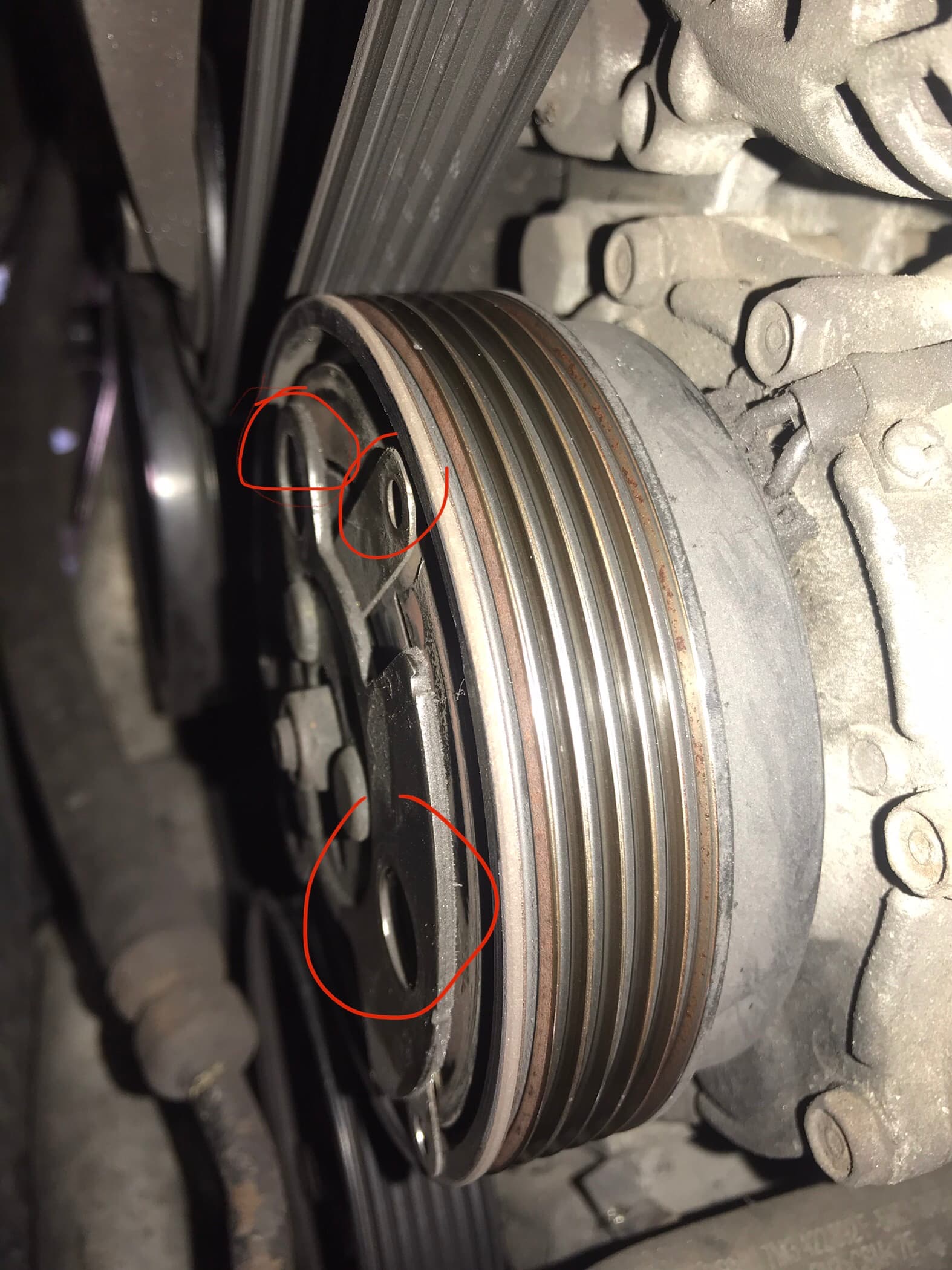 ohne die Nieten kann von der Kupplung die Kraft nicht auf die Kompressorwelle (die Mitte von dem „Stern“) übertragen werden. Also der Zustand erklärt warum die Klima nicht kalt wird.
