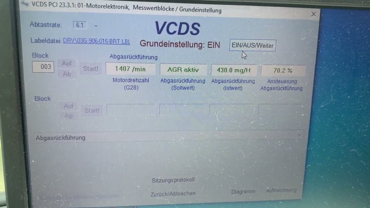 Ok, nächster Akt. Ich glaub, das Ventil will mit mir spielen. 5 km gefahren, Meldung im Kombi: Abgas Werkstatt. Ohne Ruckeln, ohne Verschlucker. Erstmal. Die kamen ca. 10 km später auf dem Weg zum Arzt. Nicht schlimm und kein Notlauf, aber eben spürbare Ruckler. Nach dem Arztbesuch waren die weg, auf dem Heimweg kaum etwas bemerkt. Lapttop hatte ich mit und nach der Meldung Stellglieddiagnose: Wieder kein Hub. ![]()