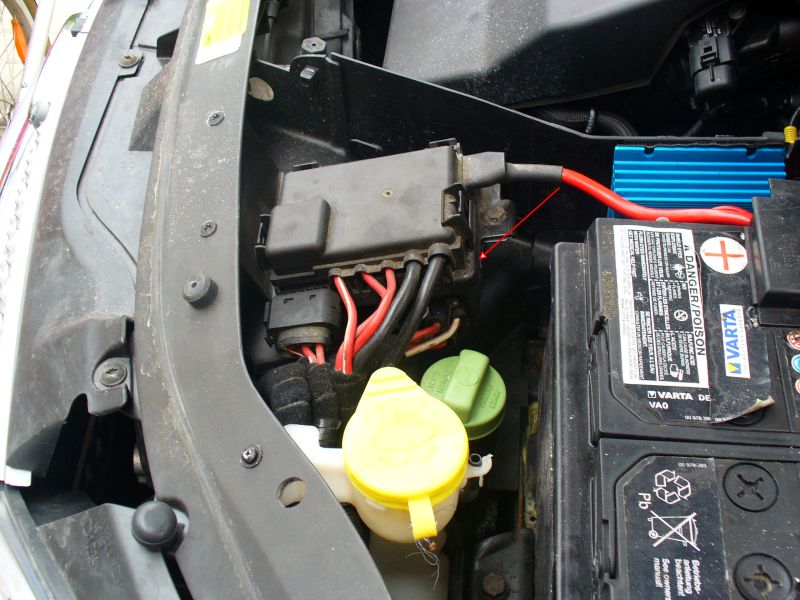 Was ich (ohne etwas zu zerlegen) auf einem dunklen Parkplatz und nur mit einer Taschenlampe bewaffnet erkennen konnte war,das der Kabelstrang direkt durch die Kunststoffverkleidung unterhalb des Sicherungskasten in Richtung Kühler verschwindet.