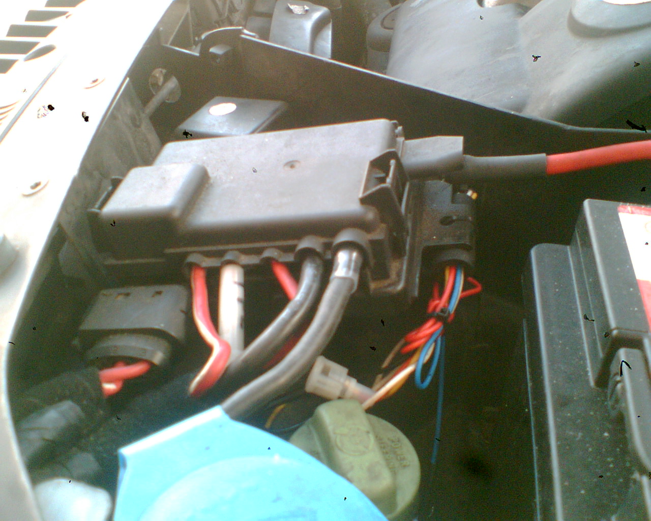 Die Drähte direkt rechts am Sicherungskasten stammen von mir, d.h. vom Tagfahrlicht. Ebenso der kleine Kasten hinten links im Bild, das ist das Steuergerät für TFL.