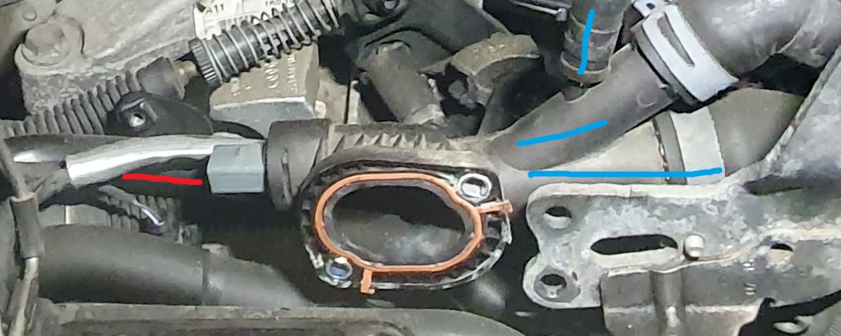 Da wo der Rote Strich ist Sitzt der Temp Geber . Jetzt wird der Fluss durch die stehende Pumpe blockiert. Thermostat macht nicht auf. Also zu wenig Fluss. Der Temp Fühler bekommt das kalte Wasser ab vom WT. und reagiert da drauf
