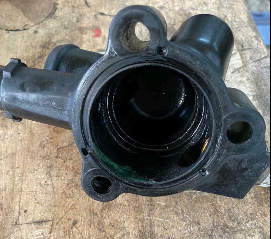 So wie das ausschaut läuft es an dem Flansch heraus ohne das das Thermostatgehäuse gerissen ist. Soweit wie ich da sehen konnte.