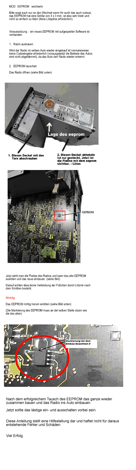 Habe den gleichen MCD Naviradio mit den gleichen Problem! Und nun die Frage wo bekomme ich noch ein EEPROM mit den abgespeicherten Daten her??? Und vielleicht auch eine Anleitung wo das Teil genau sitzt!