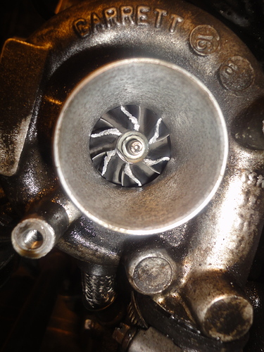 weiter gehts mit dem turbo, das turbienen rad auf der ansaugseite hat gut was auf die mütze bekommen, da wurde wohl mal ein netter fremkörper angesaugt und hinterlies so seine spuren. den turbo lasse ich komplett überholen dann ist er wie neu.