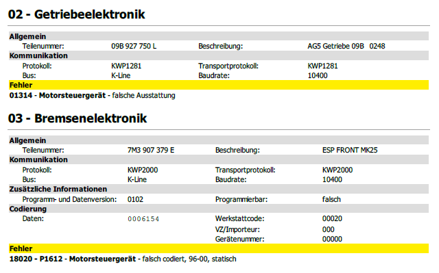 Jetzt scheint es aber so zu sein, dass das Spenderfahrzeug eine Handschalte war und meiner ein Automatik ist. Weiterhin beschwert sich die Bremsenelektronik darüber dass das Motorsteuergerät falsch Codiert ist.