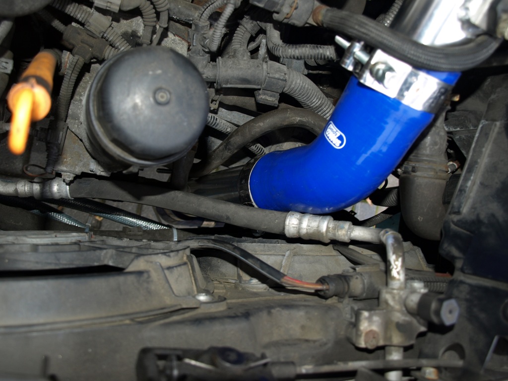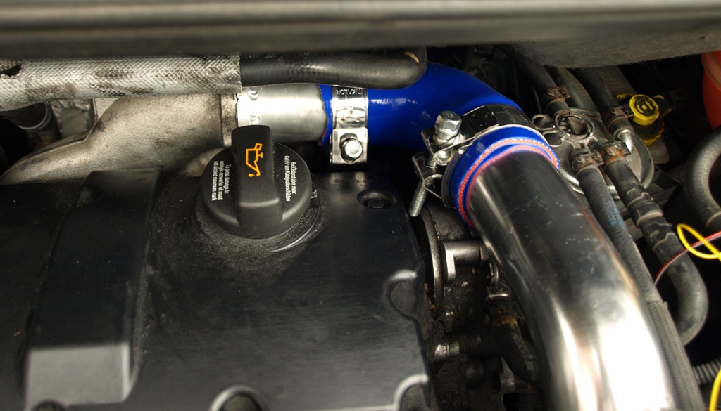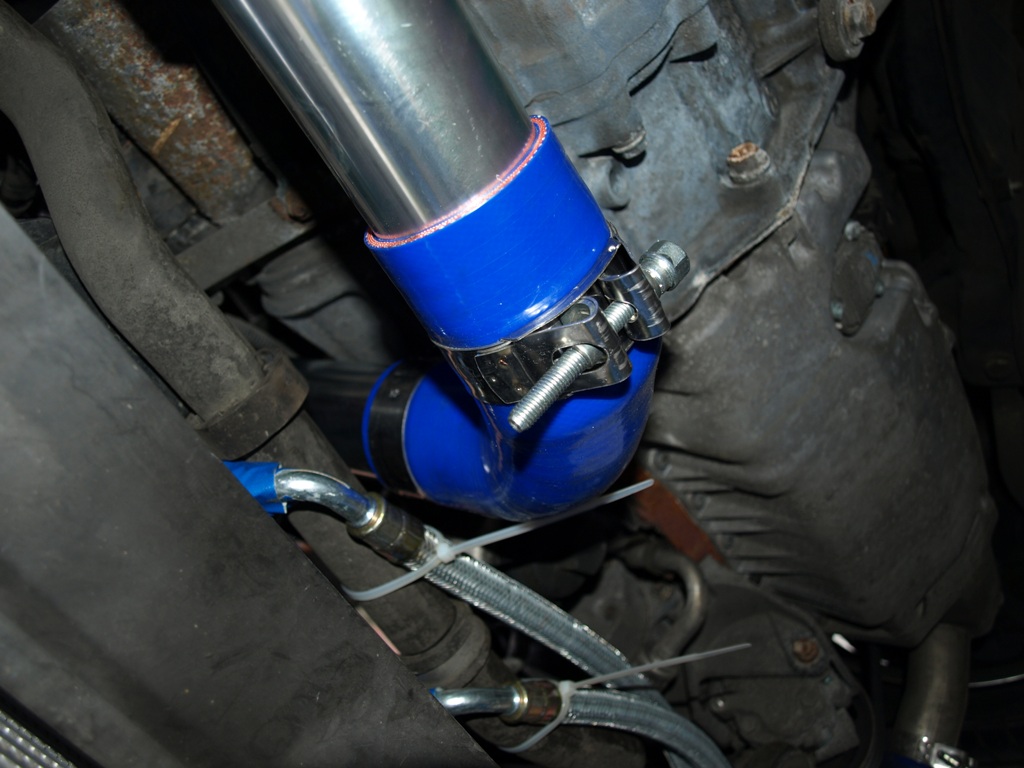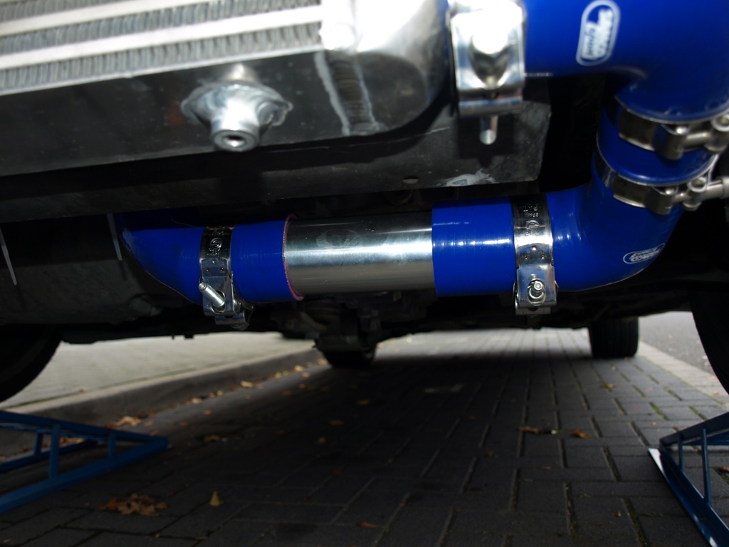 Die Verrohrung vom Ausgang LLK Richtung Ansaugkrümmer. Ebenfalls mit 60 mm Alurohren und Samco-Schläuchen.