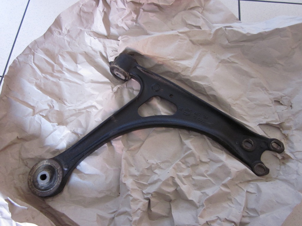 Vorderachse: Dank der sog. „A4 platform“ sind ja die Teile der auf dem Golf 4 basierenden Fahrzeuge recht gut untereinander austauschbar. Daher habe ih zwischenzeitlich die Radlagergehäuse, Guss-Querlenker, Traggelenke, Radnaben usw. vom Audi S3 verbaut. Hauptunterschied ist der längere Tragarm am Radlagergehäuse zum Traggelenk hin; dadurch wird die Achsgeometrie optimiert, wenn das Fahrzeug tiefergelegt ist (siehe oben). Das war auch keine große Zauberei und konnte an einem Nachmittag auf der heimischen Einfahrt erledigt werden. Die Querlenkerlager vom S3 sind übrigens von Haus aus stabiler als die „normalen“ G4 Lager ausgelegt. Ergebnis der Aktion war, dass mir das Fahrverhalten etwas „zackiger“ vorkam, was aber auch dem parallel eingebauten Gewindefahrwerk teilweise geschuldet wurde.