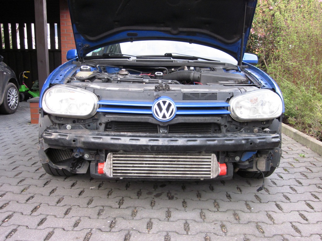 Karosserie: Eigentlich sollte die Karosserie so unauffällig wie möglich bleiben, aber der größere LLK hat „leider“ eine R32-Frontschürze notwendig gemacht. Glücklicherweise habe ich für 150 Euro inkl. Versand eine gebrauchte geschossen, die direkt in dem schicken „Mülltütenblau“ meines Wagens lackiert war. Ansonsten ist an der Karosserie nichts weiter gemacht worden, außer die Schriftzüge hinten zu entfernen.