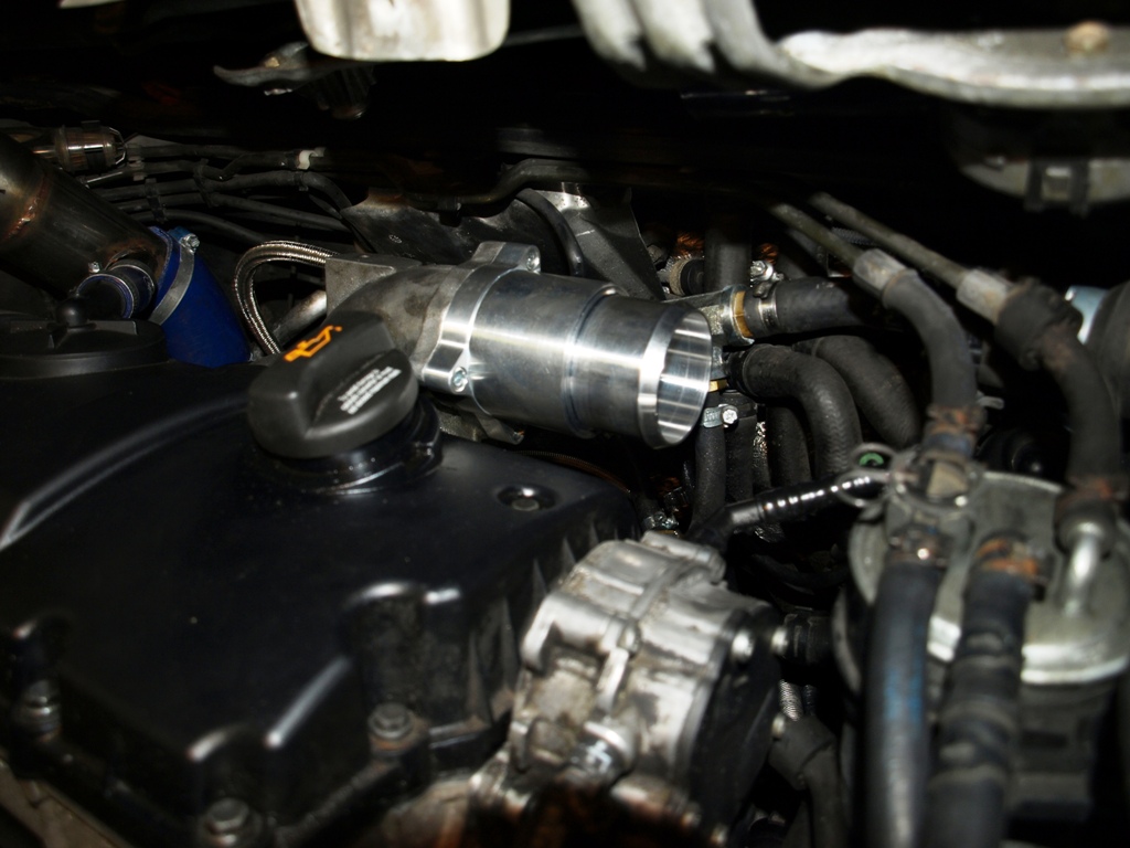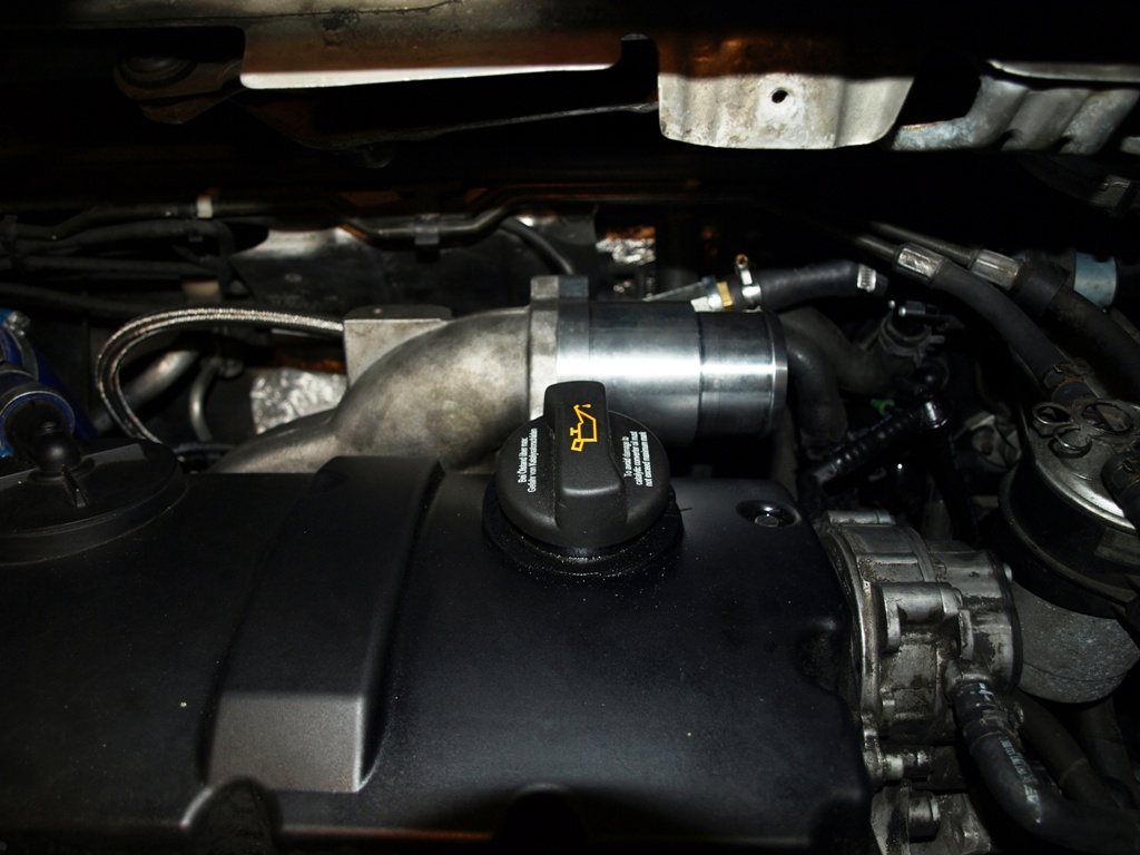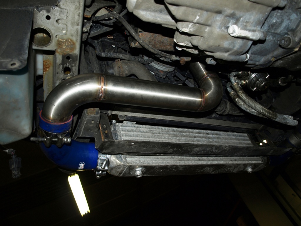 Mein Sammelsurium an Samco-Schläuchen und Alu-Rohren bot einfach zu viele Möglichkeiten für Ladeluftlecks. Außerdem haben sich die Alurohre z.T. unter dem Druck der Mikalor-Schellen oval verformt, was ebenfalls nach Ladeluftleck schreit. Daher haben wir auch 60mm Edelstahl die Ladeluftrohre hergestellt. Ich hab es leider versäumt, ein Bild von oben zu machen - aber im Grunde sind es 2 Rohre; einmal ein 45°-Rohr mit dem Ladedrucksensor und dann ein längeres Stück bis zu FMIC (siehe Bilder)
