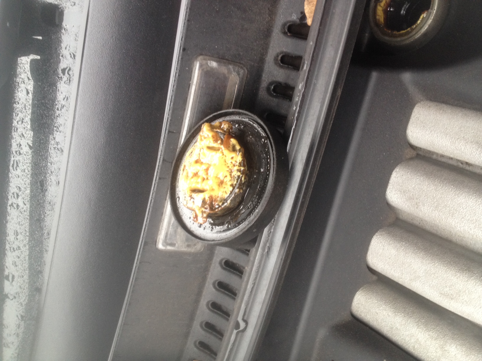 Aus der Küche kennt man ja ranzig gewordenes Öl, das sieht dann so ähnlich aus. Der Vergleich macht ja auch Sinn! In beiden Fällen ist es warmgewordenes Öl, dass dann abkühlt und irgendwann so aussieht. (Ich hab mal ein Bild angefügt, hoffe, man kann was erkennen, musste die Qualität bissl runterschrauben).