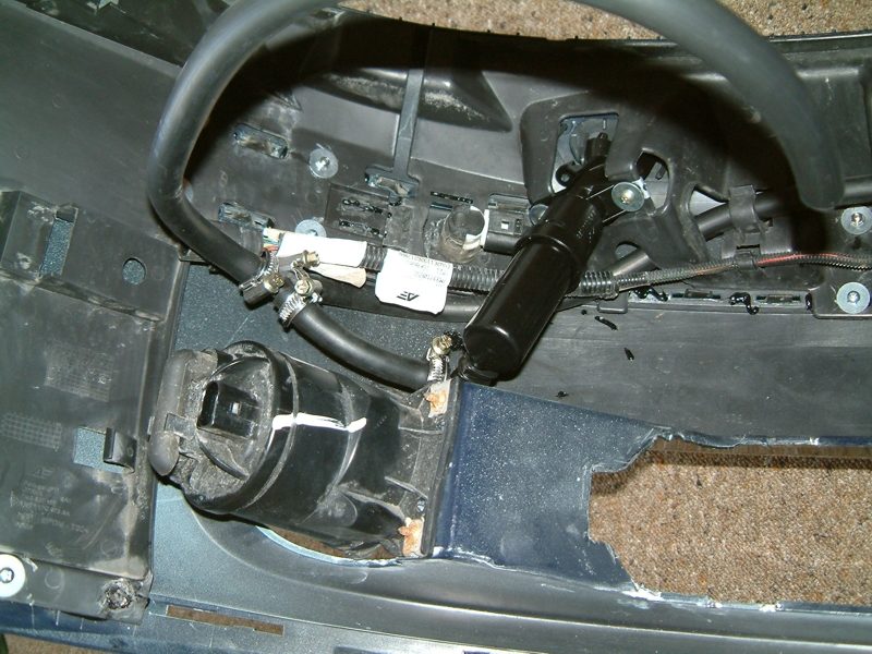 Der Stossfänger kann nun vorsichtig nach vorne abgezogen werden, dabei aber auf die Verbindungsleitung zur Einparkhilfe (falls vorhanden) und die Anschlusskabel der Nebelscheinwerfer aufpassen. Die Einparkhilfe kann an dem 6poligen Stecker an der linken Stossfängerinnenseite getrennt werden, die Kabel zu den Nebelscheinwerfern sind direkt an den Lampen gesteckt.