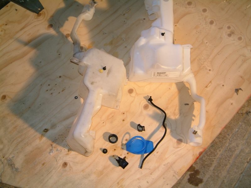 Der Wasserbehälter selbst ist mit 2 Muttern M6 befestigt. Alle Anbauteile des alten Wasserbehälters (Deckel mit Sieb, Wasserstandsschalter, Entlüftungsschlauch, die Pumpe für die Scheibenwaschanlage, der Kabelhalter und der selbstklebende Dämmstreifen) können weiter verwendet werden und werden deshalb vor Einbau des neuen Behälters an diesen umgebaut. Nach dem Einbau des Behälters wird der Stossfängerträger wieder angebaut.