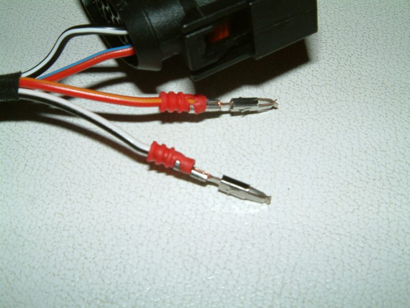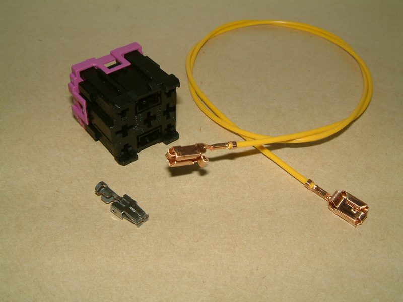 In Pin 4 und 6 müssen spezielle Flachstecker, die es einzeln zum ancrimpen scheinbar bei VW nicht gibt, hier habe ich dann die Kontakte der Einzelleitung 000 979 114 verwendet (das Adernende mit dem Kontakt kurz abschneiden und mit einem Verbinder an die jeweilige Leitung anbringen).