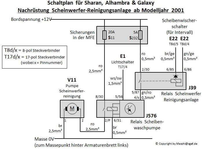 Das Relais J39 zieht also immer an wenn die Frontscheibenwaschanlage betätigt wird, und gibt damit Spannung vom X-Kontakt (über Sicherung 32) auf Pin 4 des Relais J576 (Relais für Scheinwerfer-Waschpumpe). Pin 5 des Relais J576 ist mit dem Abblendlicht-Kontakt am Lichtschalter verbunden.