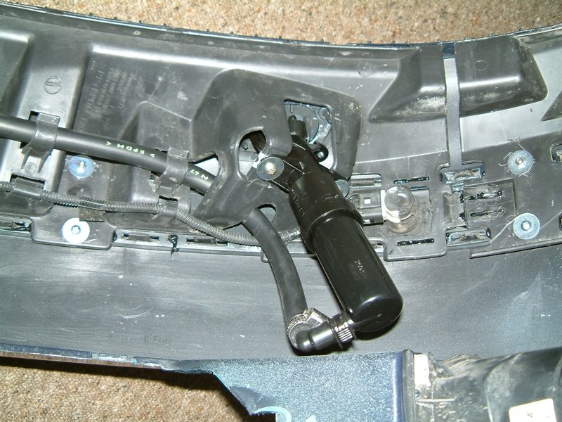 Er wird jetzt auf Länge geschnitten, das Anschlusstück mit Schlauchschelle befestigt und auf den Pumpenstutzen gesteckt, dabei den Sicherungsclip nicht vergessen. Wenn jetzt noch die Leitung für die Einparkhilfe wieder verbunden wird und die Nebelscheinwerfer wieder angeschlossen sind kann der Spoiler wieder eingeclipst und der Stossfänger mit allen 12 Schrauben und den 3 Spreiznieten wieder befestigt werden. Jetzt kann auch der Wasserbehälter gefüllt werden, dabei nicht den Frostschutz vergessen, damit die Hubzylinder nicht gleich kaputtfrieren.