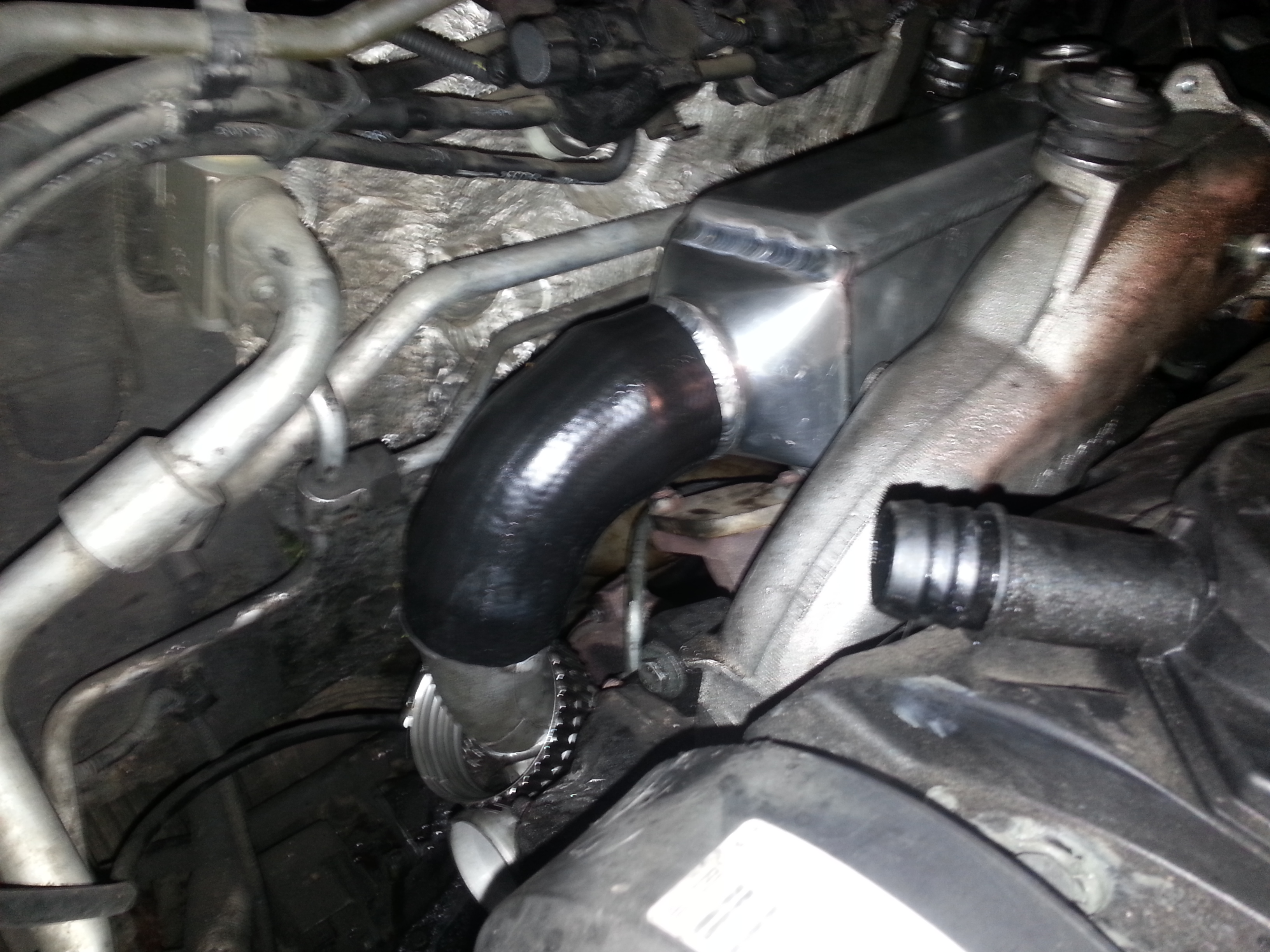 Habe ein Wassergekühlten Ladeluftkühler direkt über dem Turbolader bzw hinter der Ansaugbrücke verbaut. Somit viel besseres Ansprechverhalten da du nur einen ganz kurzen Weg bis zur Ansaugbrücke hast und immer eine effiziente Kühlung. Da er an einem 2ten Wasserkreislauf hängt.