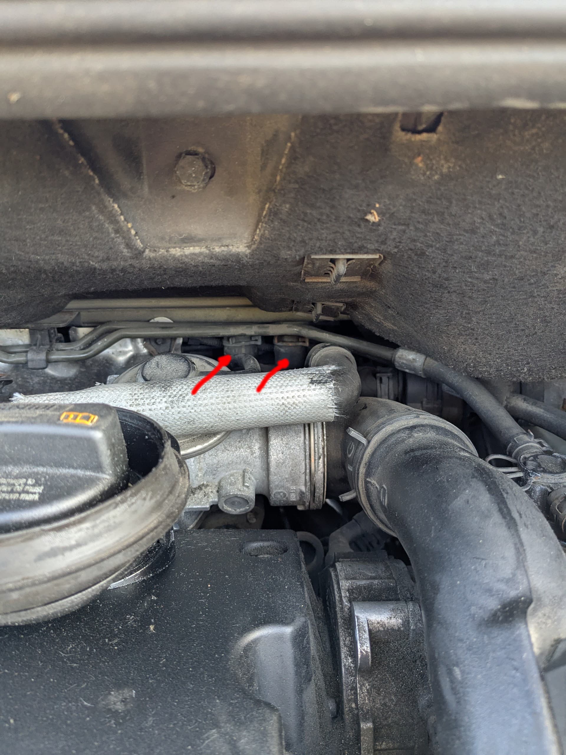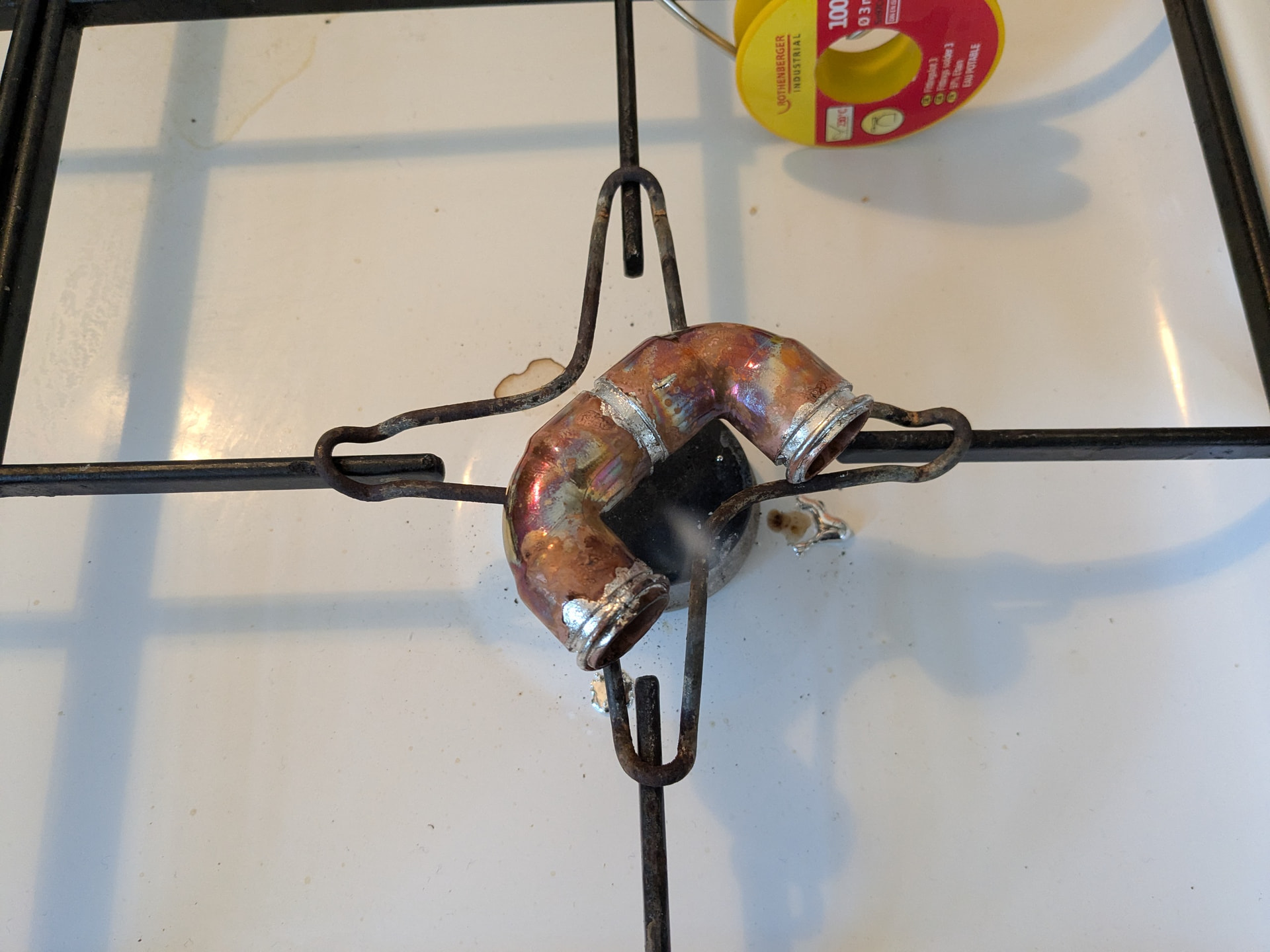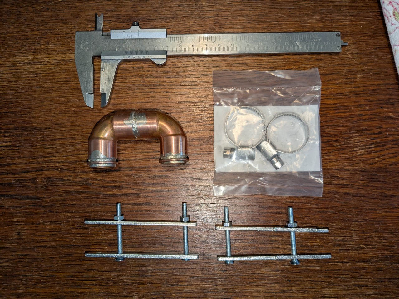 Wie auch immer, ich wollte keinesfalls irgendwo auf der Autobahn liegen bleiben und hatte mir dort vor Ort zum Einen gemäß Bernds Vorschlag zwei provisorische Klemmen zum Abquetschen der Schläuche zum Wärmetauscher zusammengebastelt. Dann habe ich aber gesehen, dass ich damit einen Sensor vom Wasserstrom abtrennen würde, s. Foto, und das schien mir bedenklich. Also habe ich mir wie Benny_Rose aus Kupferrohr einen U-Bogen gelötet, s. Foto (das Ferienhaus hatte glücklicherweise einen Gasherd).