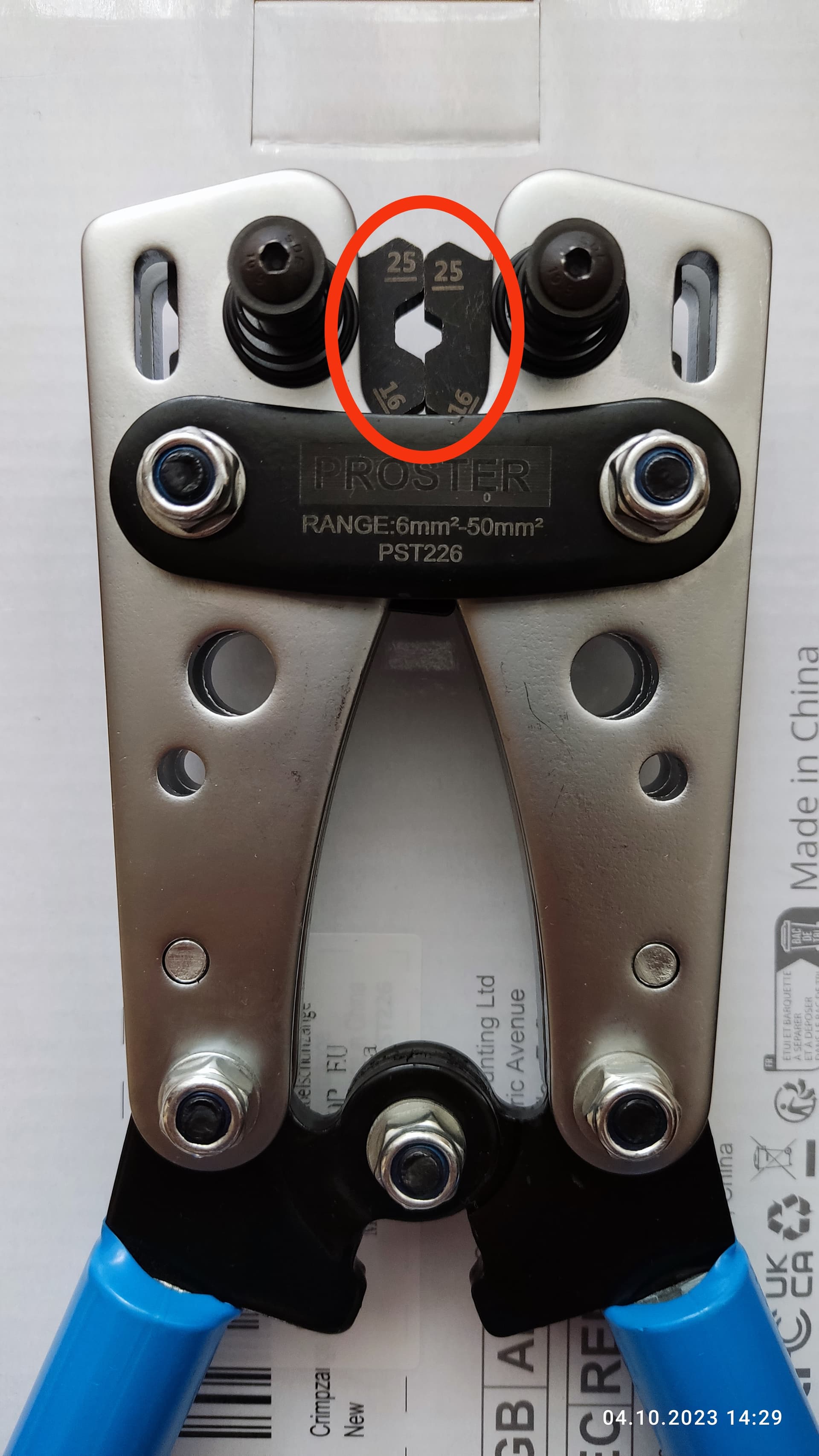 Mein Kabel ist aber kein 25mm² sonder nur 16mm², ein Rohrkabelschuh für 16mm² passt schön drauf mit etwas Spiel. Ich hatte aber schon vorher mein 25mm² Kabel vorbereitet.