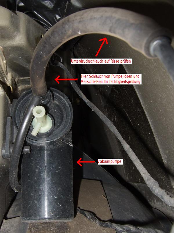 - Wenn 1a, dann prüfen, ob Schlauch an der Vakuumpumpe hinter dem Blinker links vorne eingerissen ist.