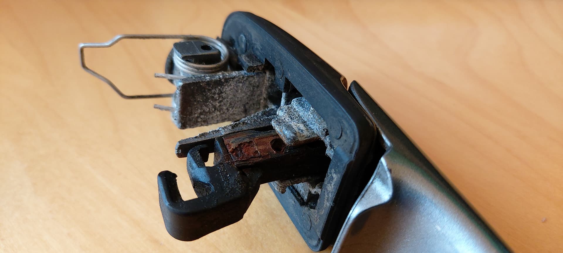 Nach dem Ausbau meines hängenden Türgriffs bot sich mir dieses Bild (das erklärt warum der Griff hing).