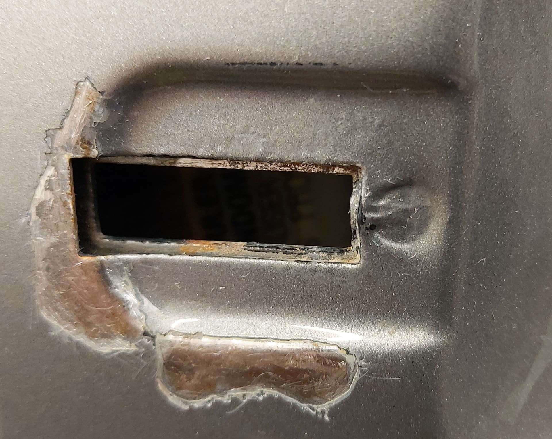 Bevor die frisch lackierten Griffe wieder in die Tür reinkommen habe ich mir noch so eine komisch aussehende Blase angeschaut. Es kam wie es kommen musste: Aufmachen, Rost drunter weg machen, grundieren. Heute Abend dann Ränder schleifen und Basislack drauf machen, bevor der Klarlack den Abschluss bildet.