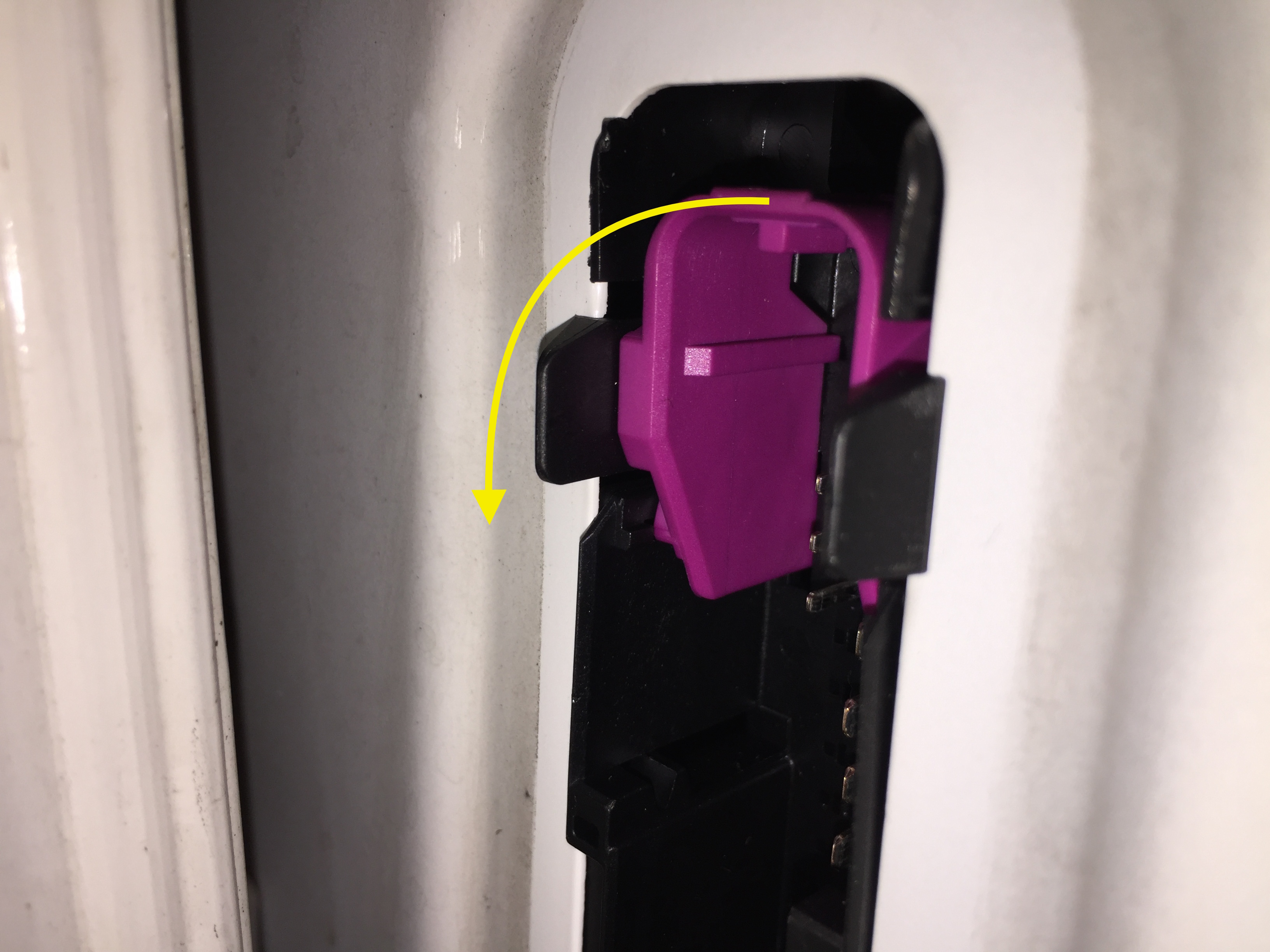 Die Rastnasen sind mit einem violetten Bügel gesichert - dieser muss um 90° nach unten geklappt werden damit die Rastnasen zusammengedrückt werden und der Stecker ausgehängt werden kann.