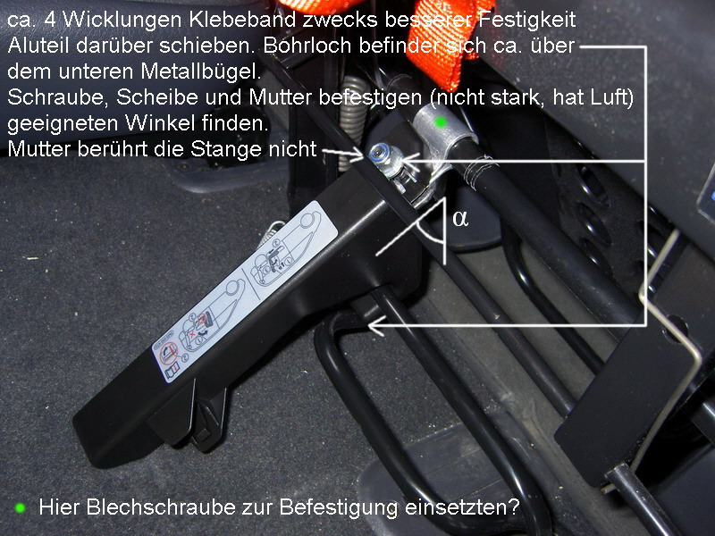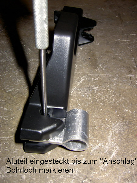 Natürlich bewegt sich das ganze auf dem geklemmten Klebeband etwas. Hier stellt sich die Frage ob man ein kleines Loch durch die Alulasche und die Stahlstrebe bohrt (wie im Bild mit dem grünen Punkt angedeutet) und somit das Ganze gegen verrutschen und verdrehen sichert. Was mir nicht klar ist, welche Festigkeitsfunktion die Stahlstrebe hat und ob ein Loch diese mindert?