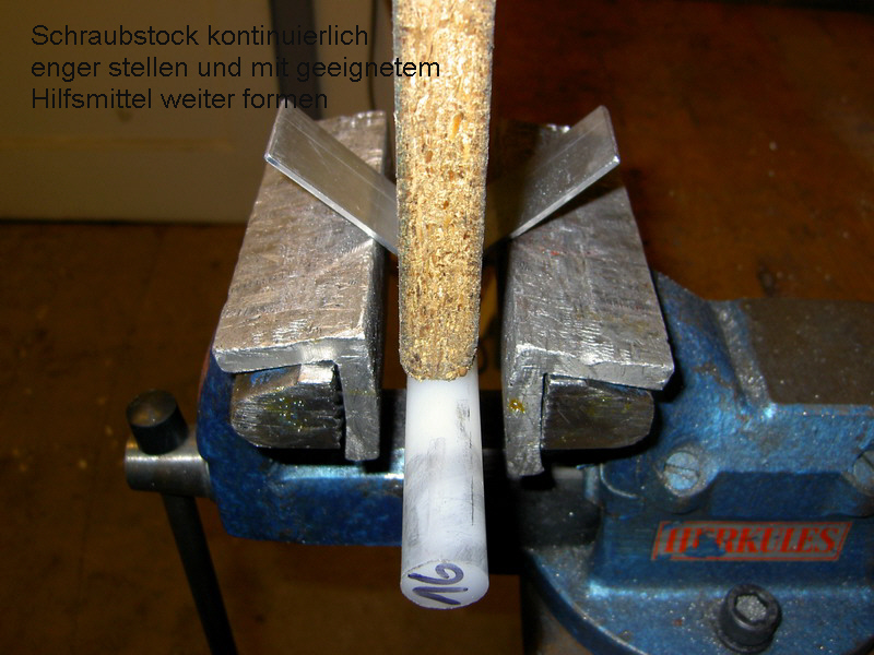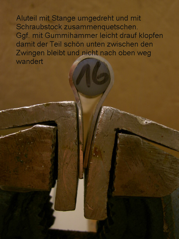 Danach das Holzteil entfernen, den Stab mit dem darauf befindlichen U-Aluteil umdrehen und in den Schraubstock einspannen: