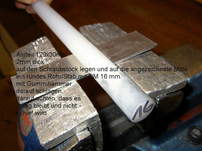 Der Stab sollte rechtwinklig zur Seitenkante des Aluteils, möglichst mittig am Blech und parallel zu den Backen beim Schlagen gehalten werden (ist nicht unmöglich, aber auch nicht leicht). Der Aluteil wiederum mittig auf den geöffneten Backen und rechtwinklig dazu liegen.